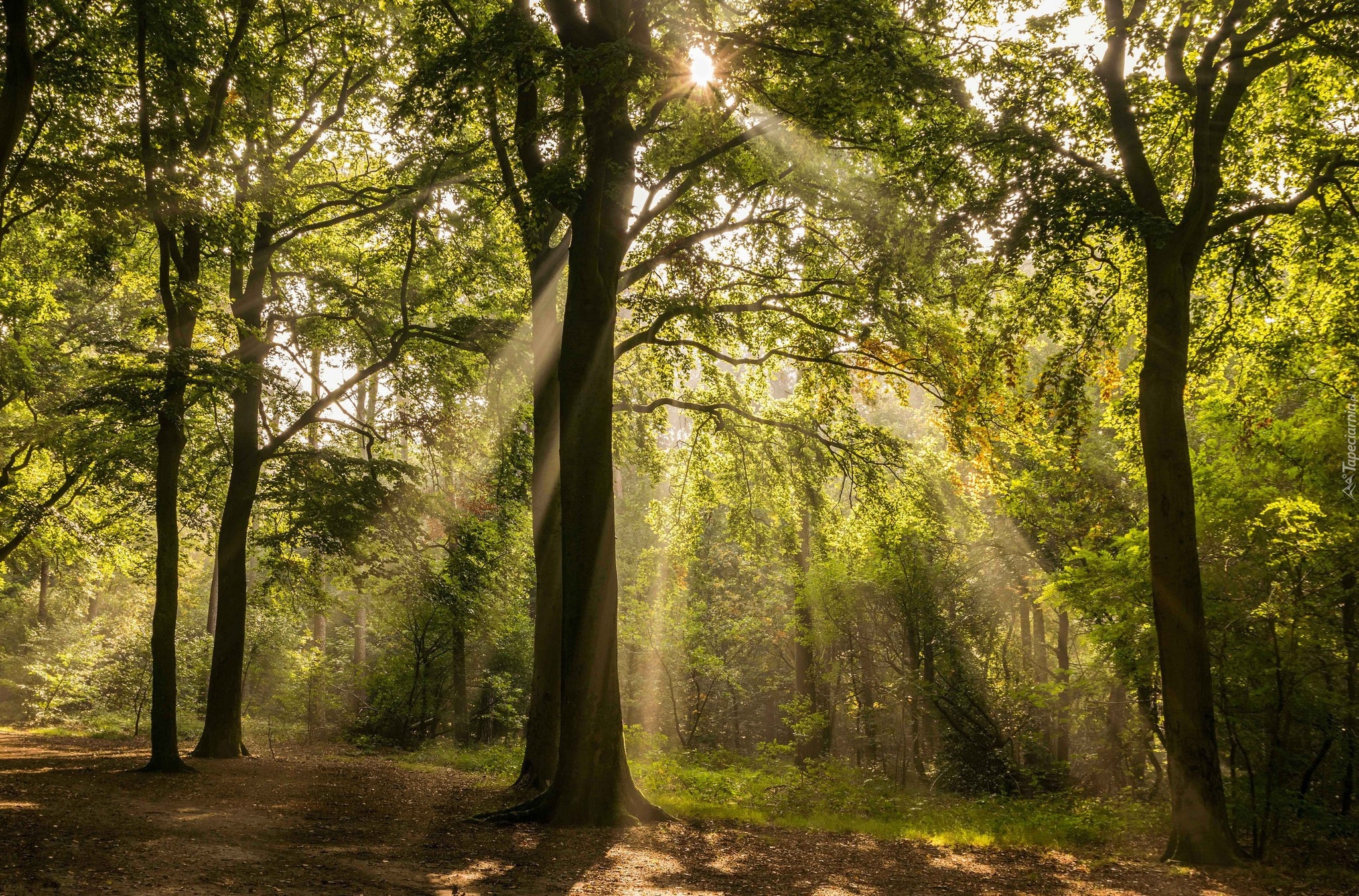 Edytor tapety: Wpadające do lasu promienie słoneczne