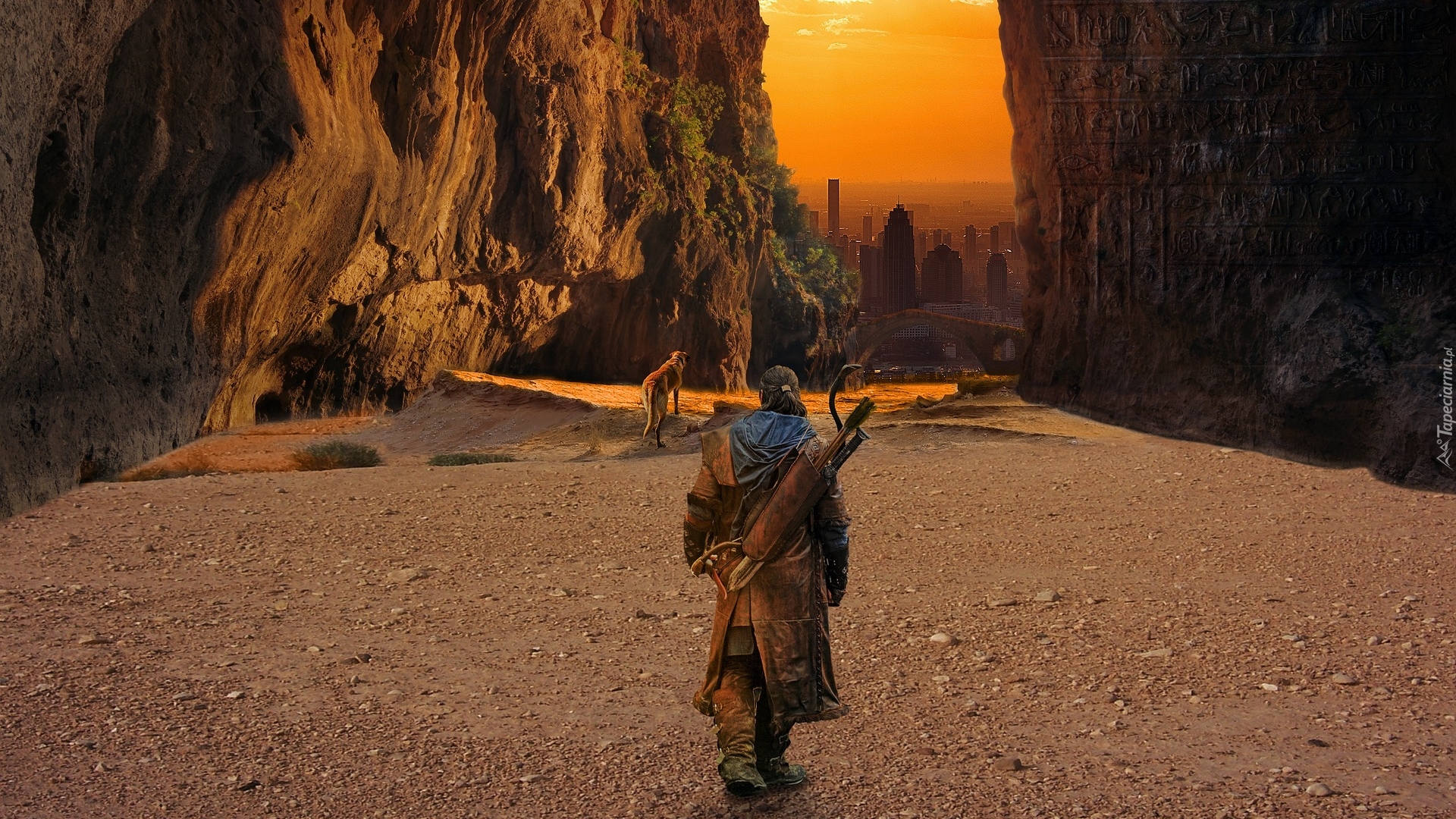 Edytor tapety: Myśliwy z łukiem zmierzający w kierunku miasta