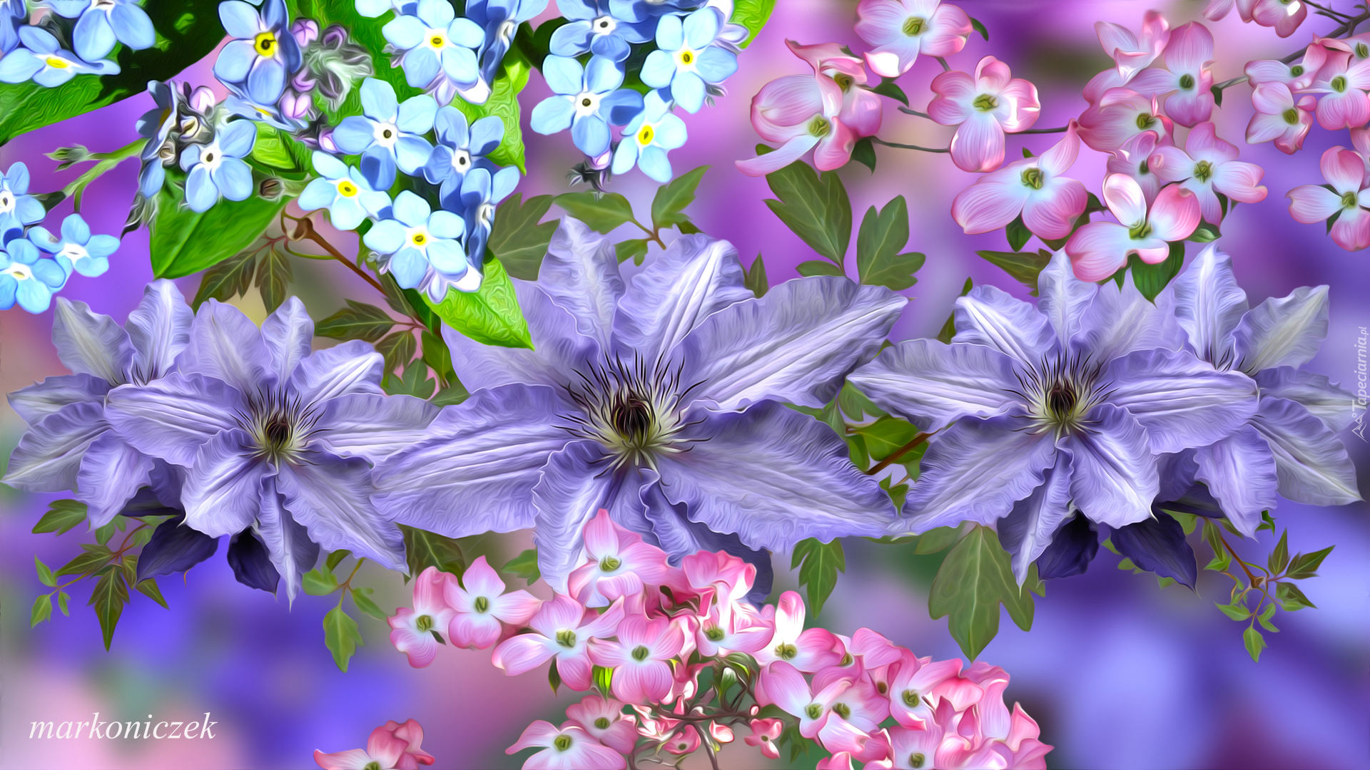 Edytor tapety: Powojniki obok niezapominajek i derenia