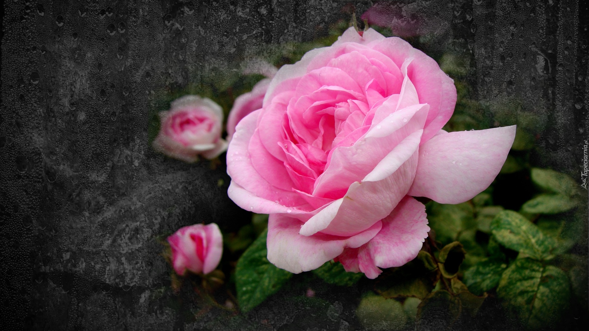 Edytor tapety: Różowa róża z pąkami za mokrą szybą