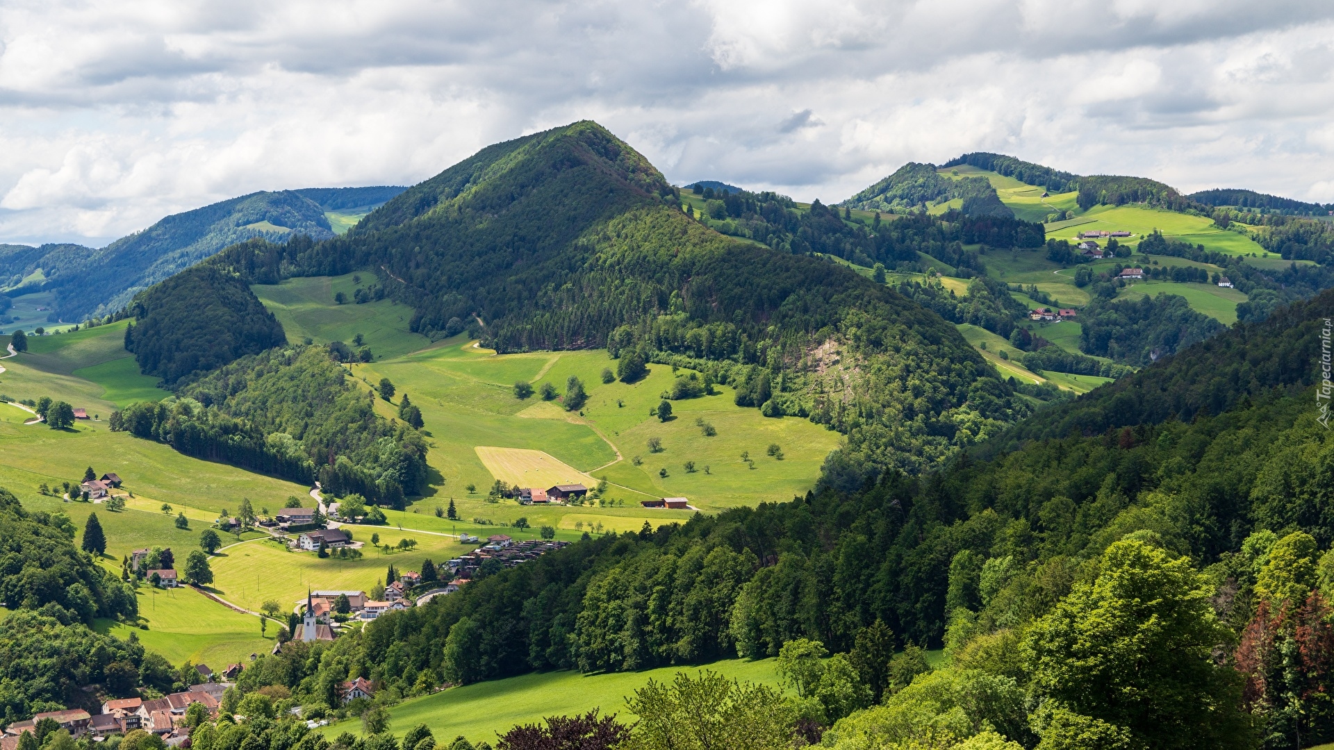 Edytor tapety: Zalesione wzgórza w szwajcarskiej miejscowości Langenbruck