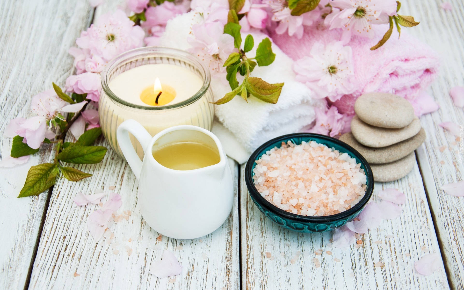 Edytor tapety: Sól w miseczce obok dzbanuszka i zapalonej świecy