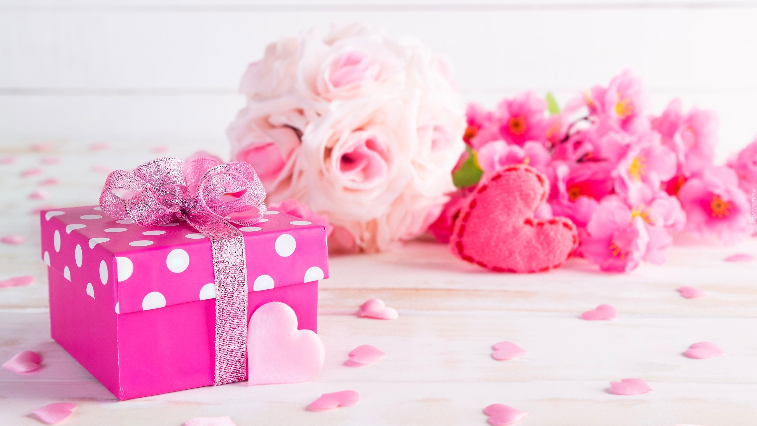 Edytor tapety: Prezent w różowym pudełku obok serduszek i kwiatów