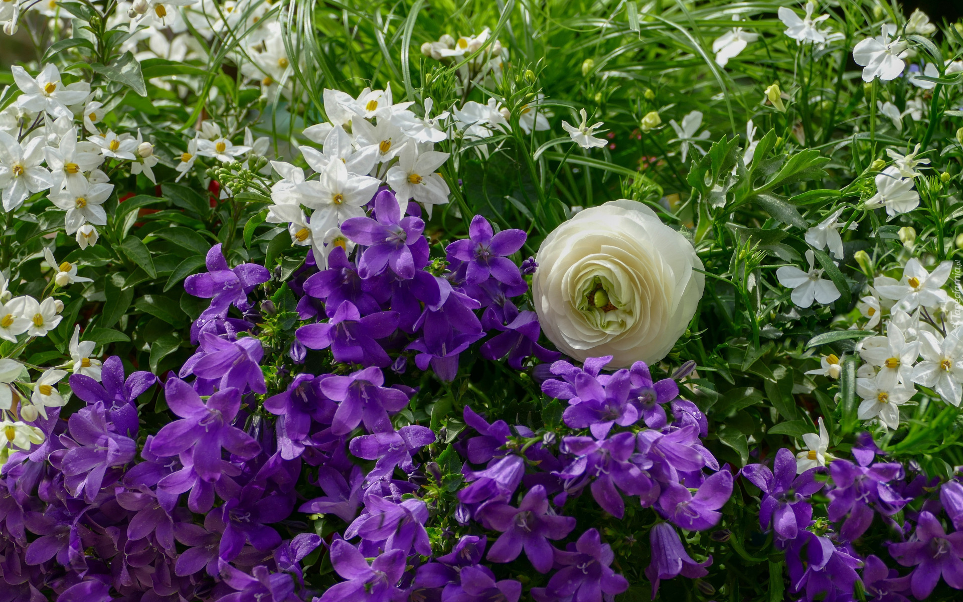 Edytor tapety: Jaskier pośród dzwonków dalmatyńskich i psianki jaśminowej