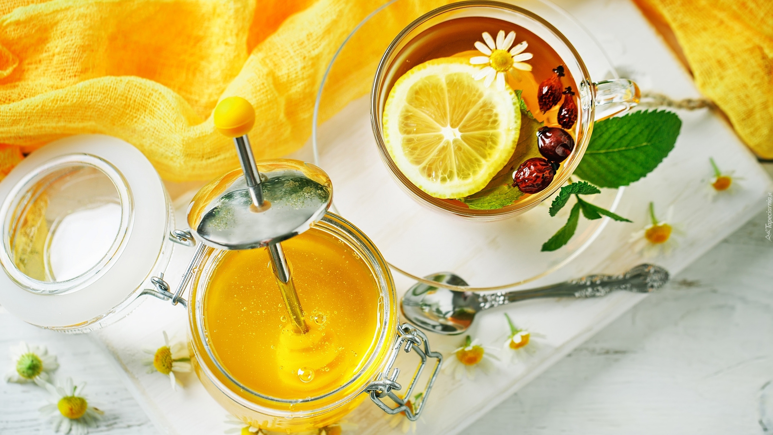 Edytor tapety: Herbata z cytryną obok słoika miodu