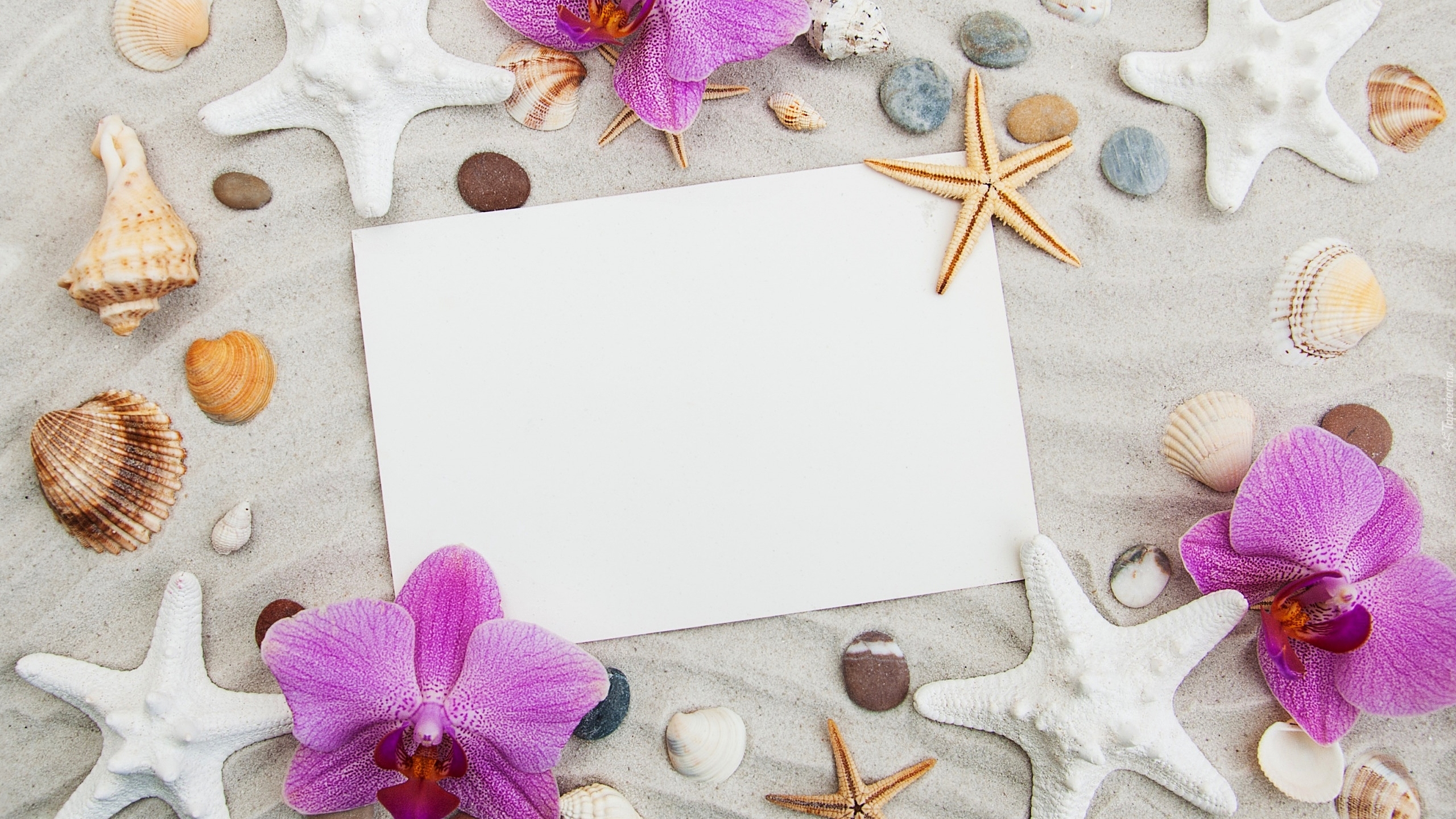Edytor tapety: Orchidee muszelki i rozgwiazdy ułożone wokół kartki
