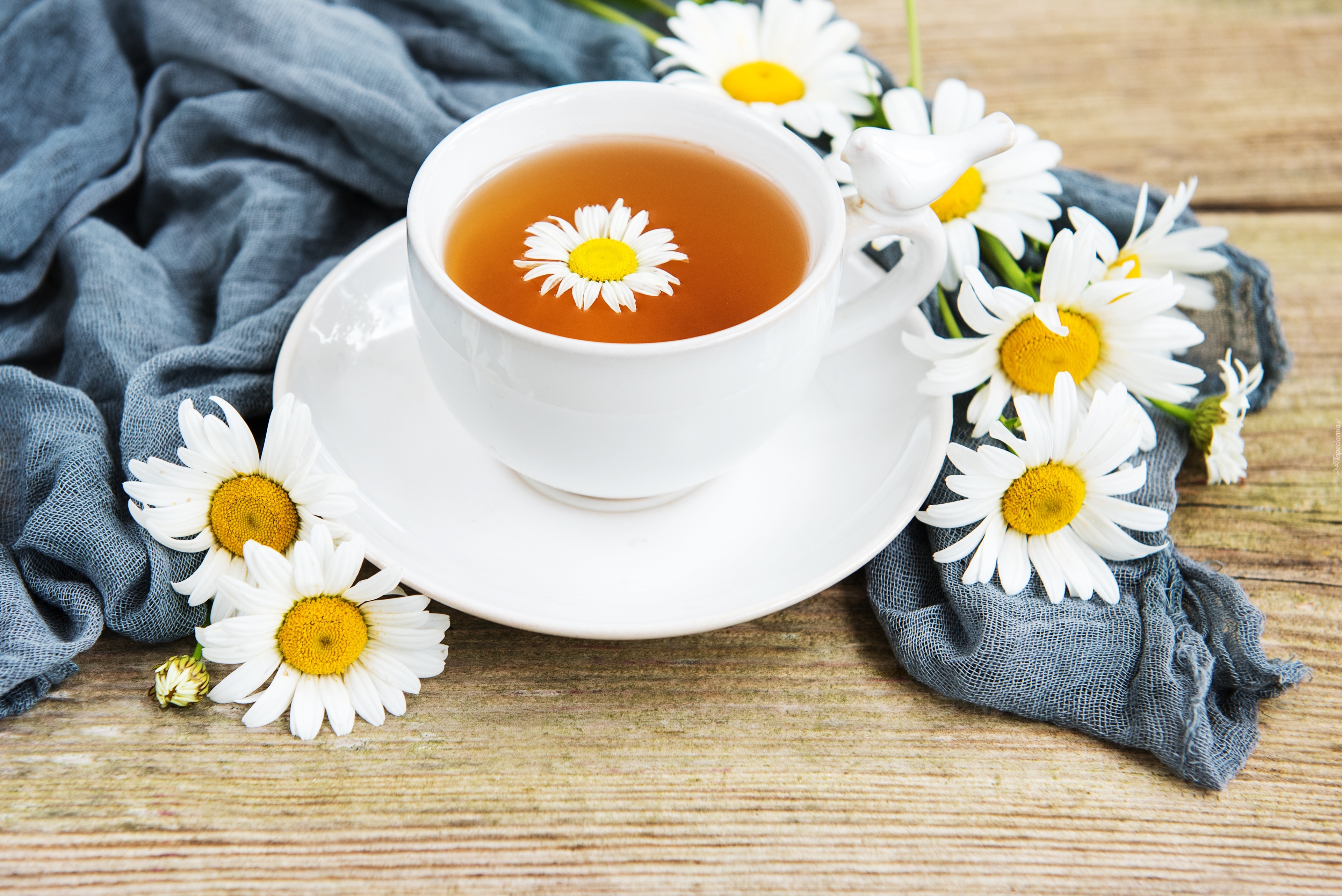 Edytor tapety: Herbata rumiankowa w filiżance na materiale