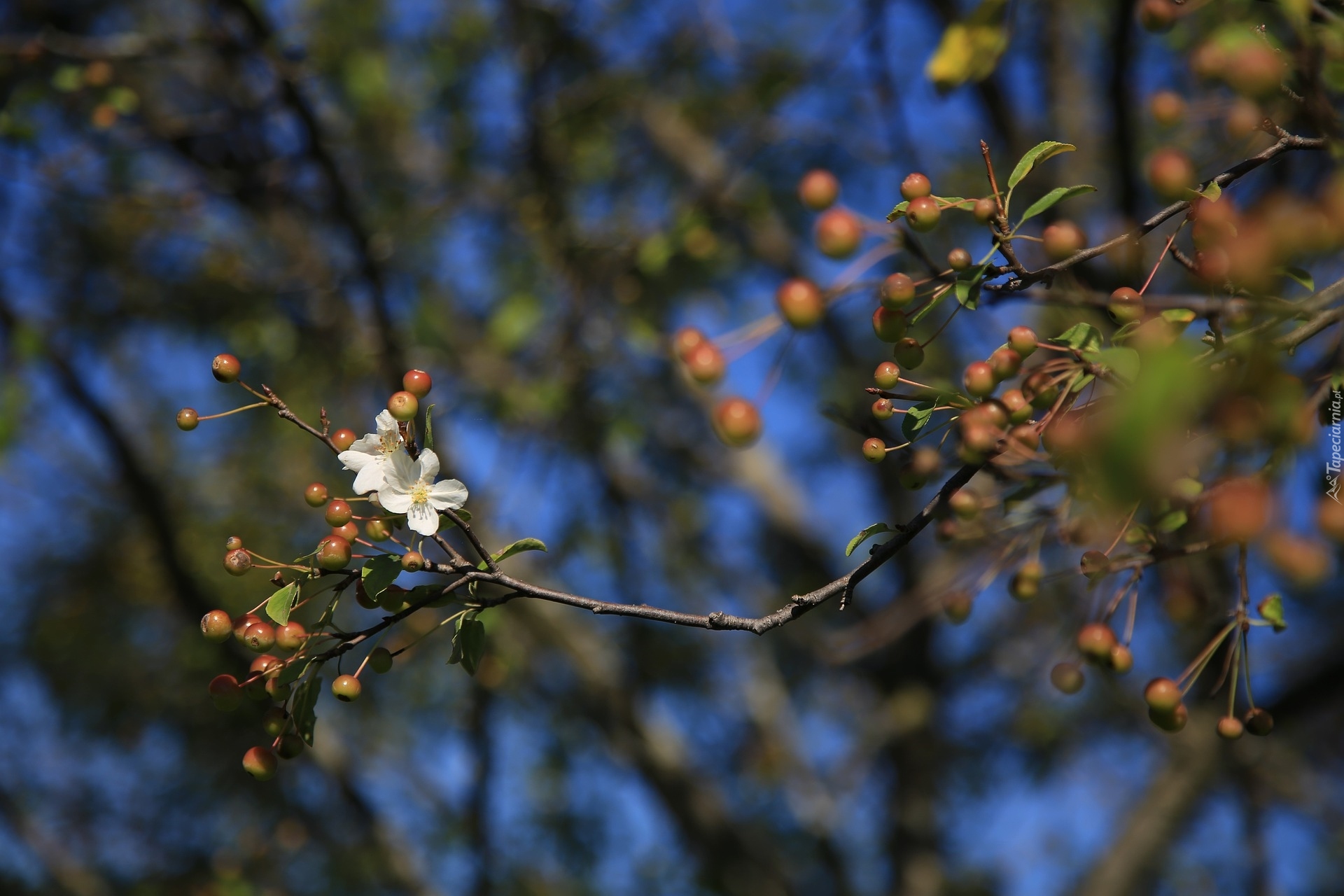 Edytor tapety: Białe kwiaty i owoce na gałązce drzewa owocowego