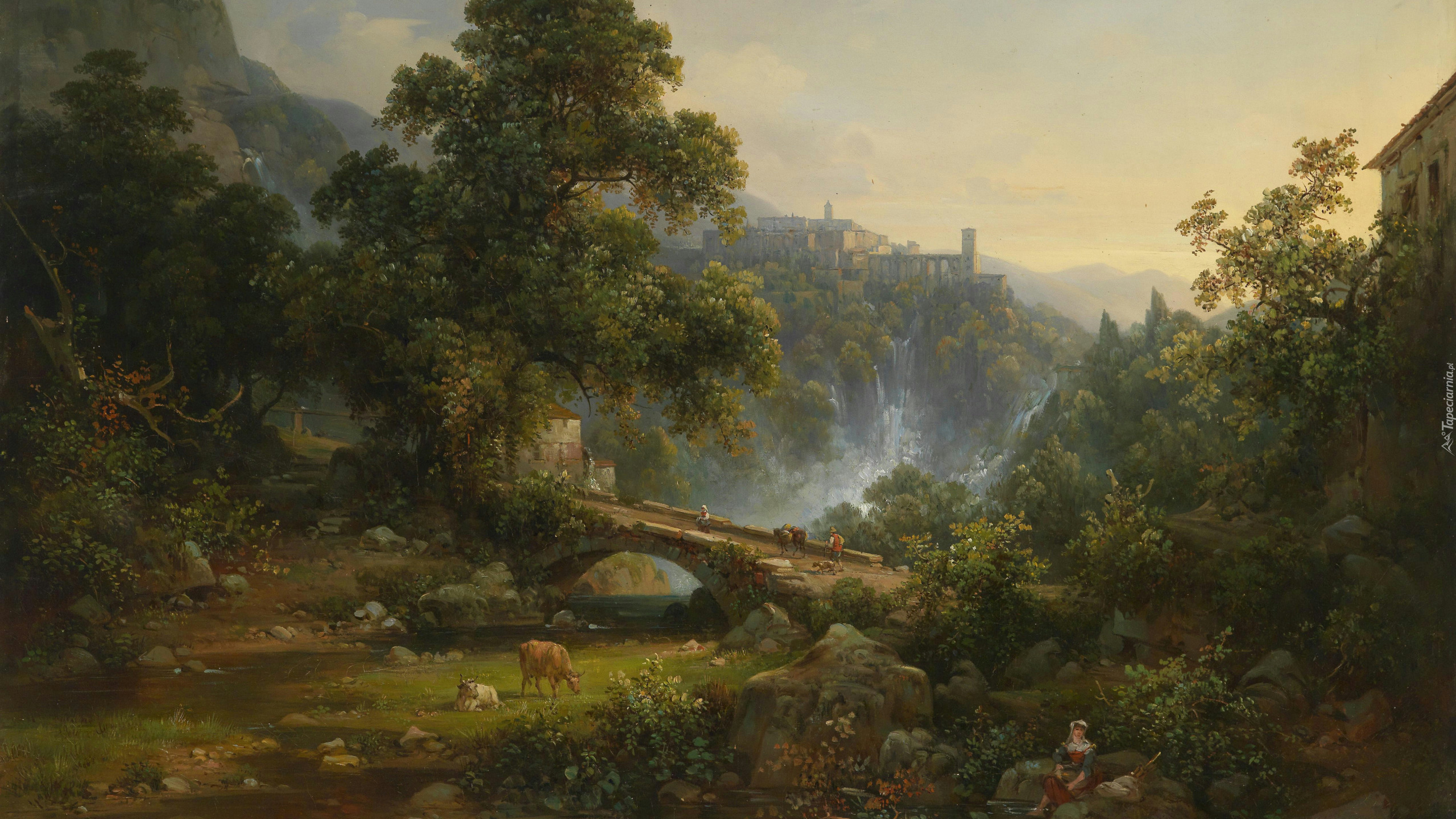 Edytor tapety: Drzewa nad kamiennym mostem w malarstwie