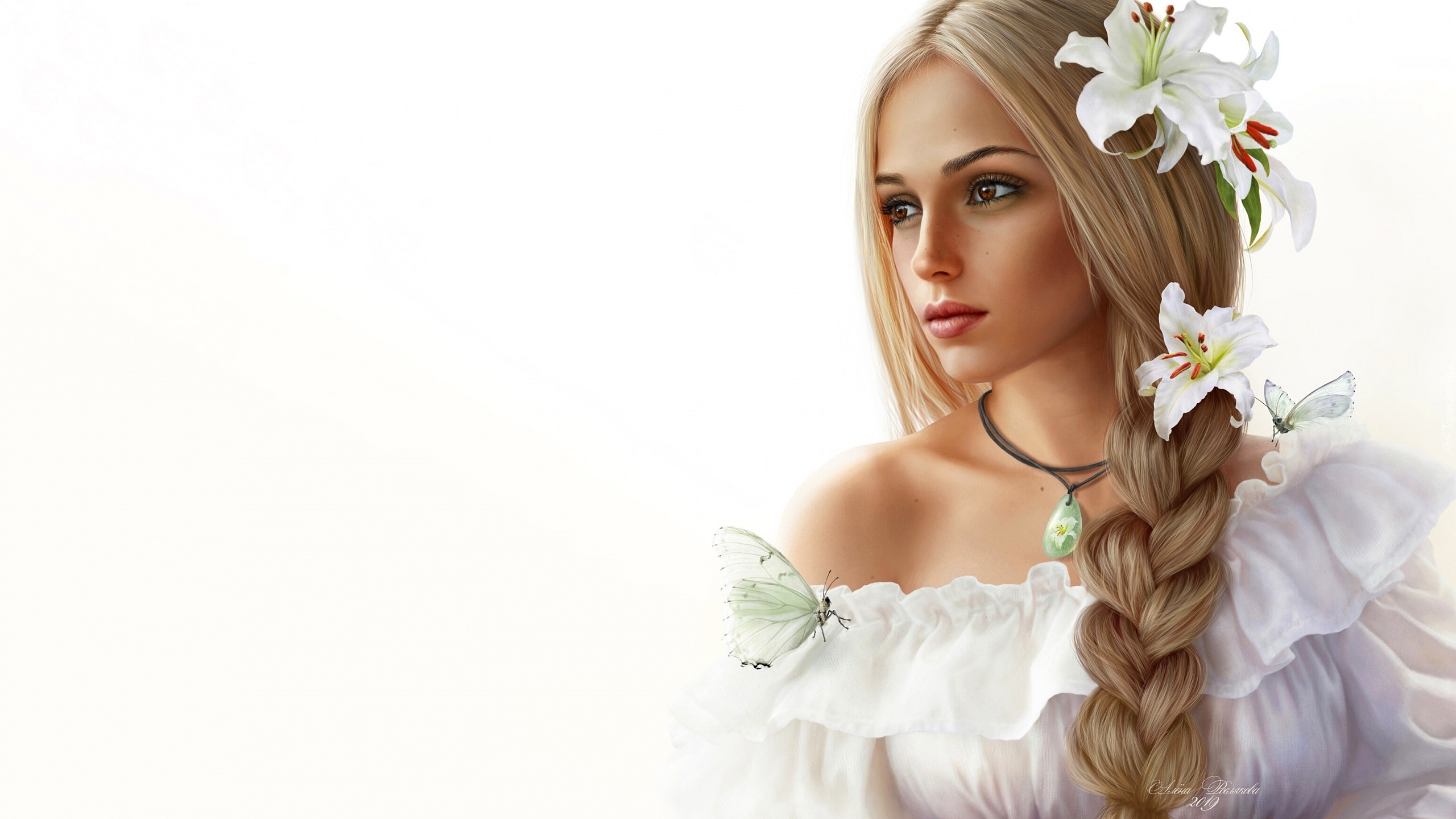 Edytor tapety: Blondynka w białej bluzce z liliami we włosach