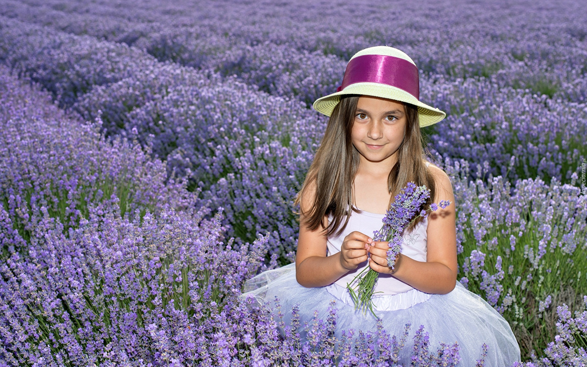Edytor tapety: Dziewczynka w kapeluszu na polu lawendowym