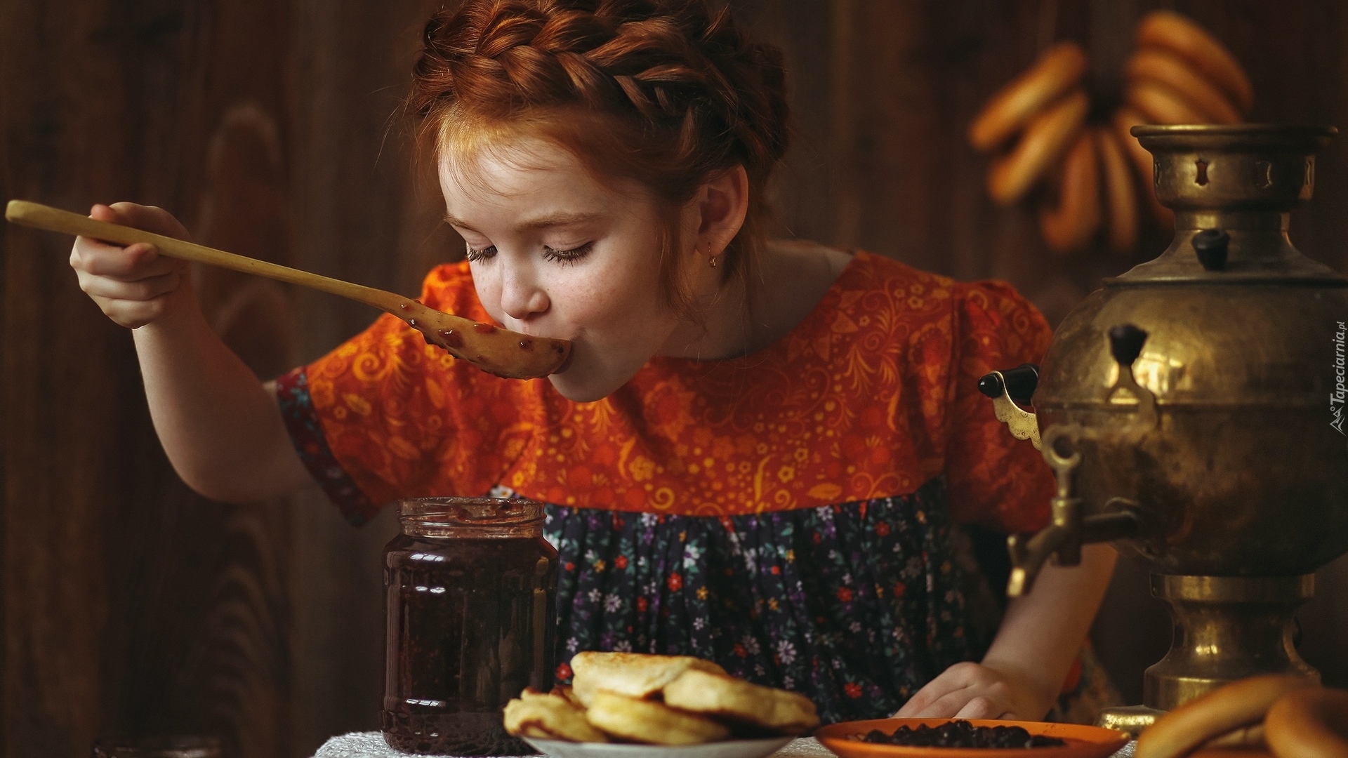 Edytor tapety: Rudowłosa dziewczynka jedząca powidła