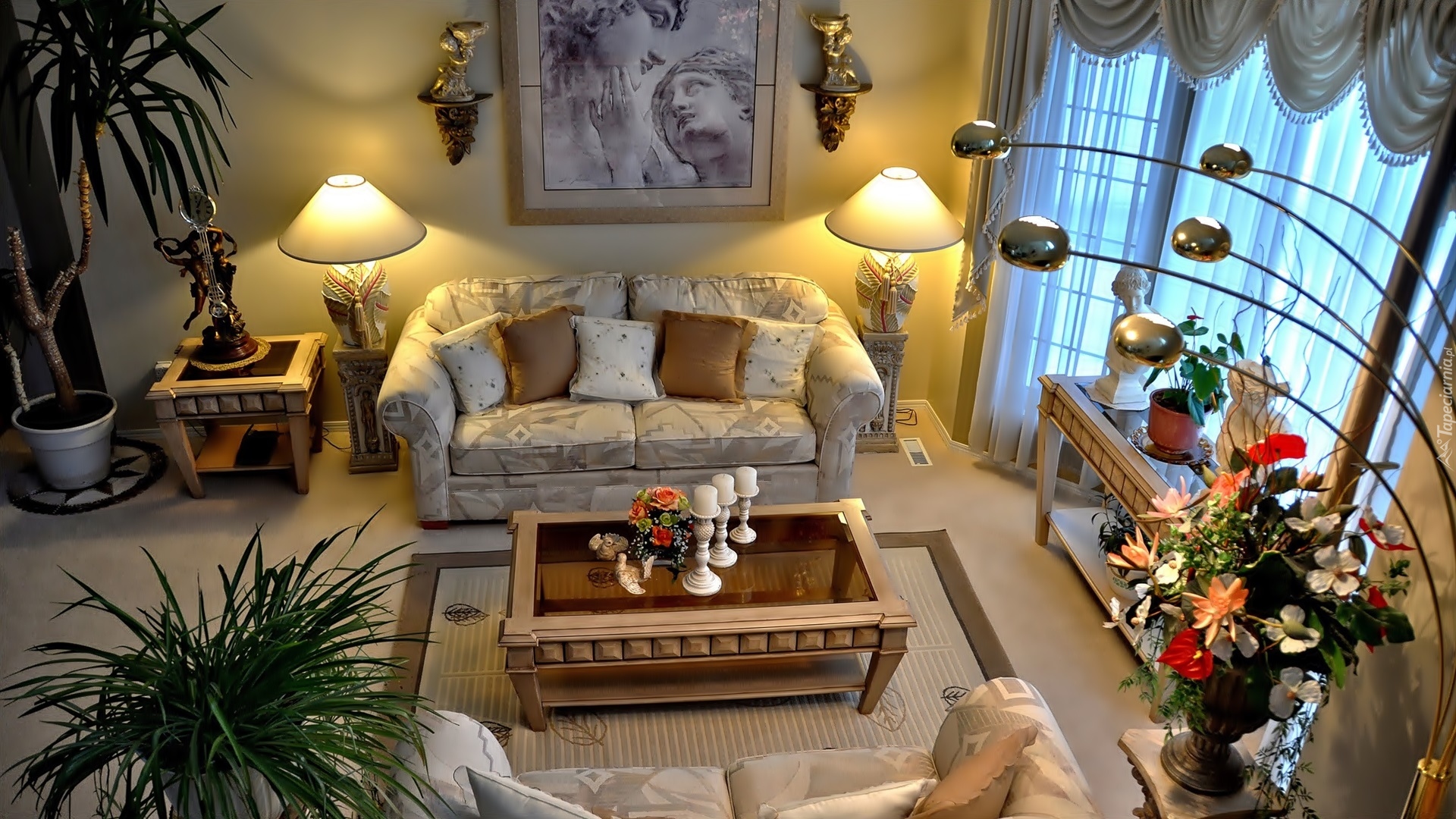 Edytor tapety: Wnętrze salonu oświetlone lampami