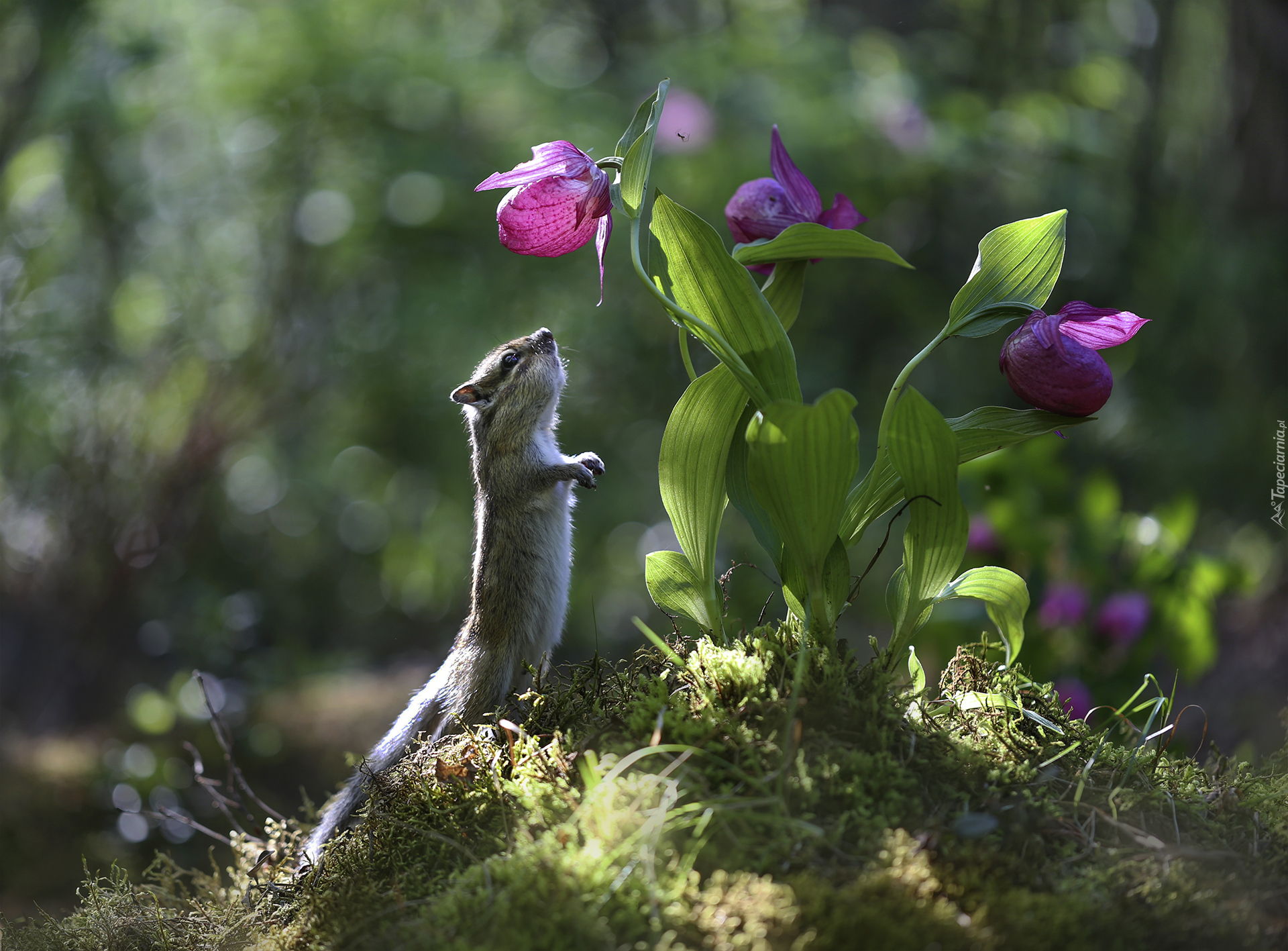 Edytor tapety: Pręgowiec obok fioletowych kwiatków