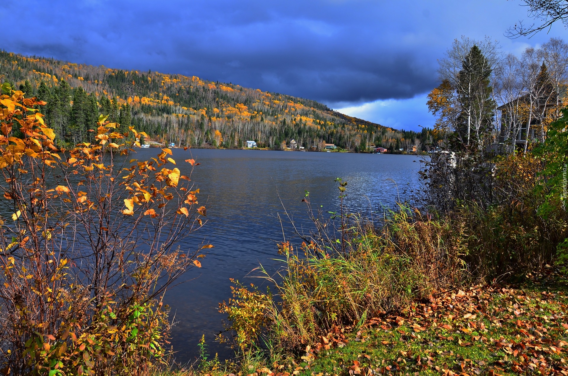 Edytor tapety: Wzgórze i jesienne drzewa nad rzeką