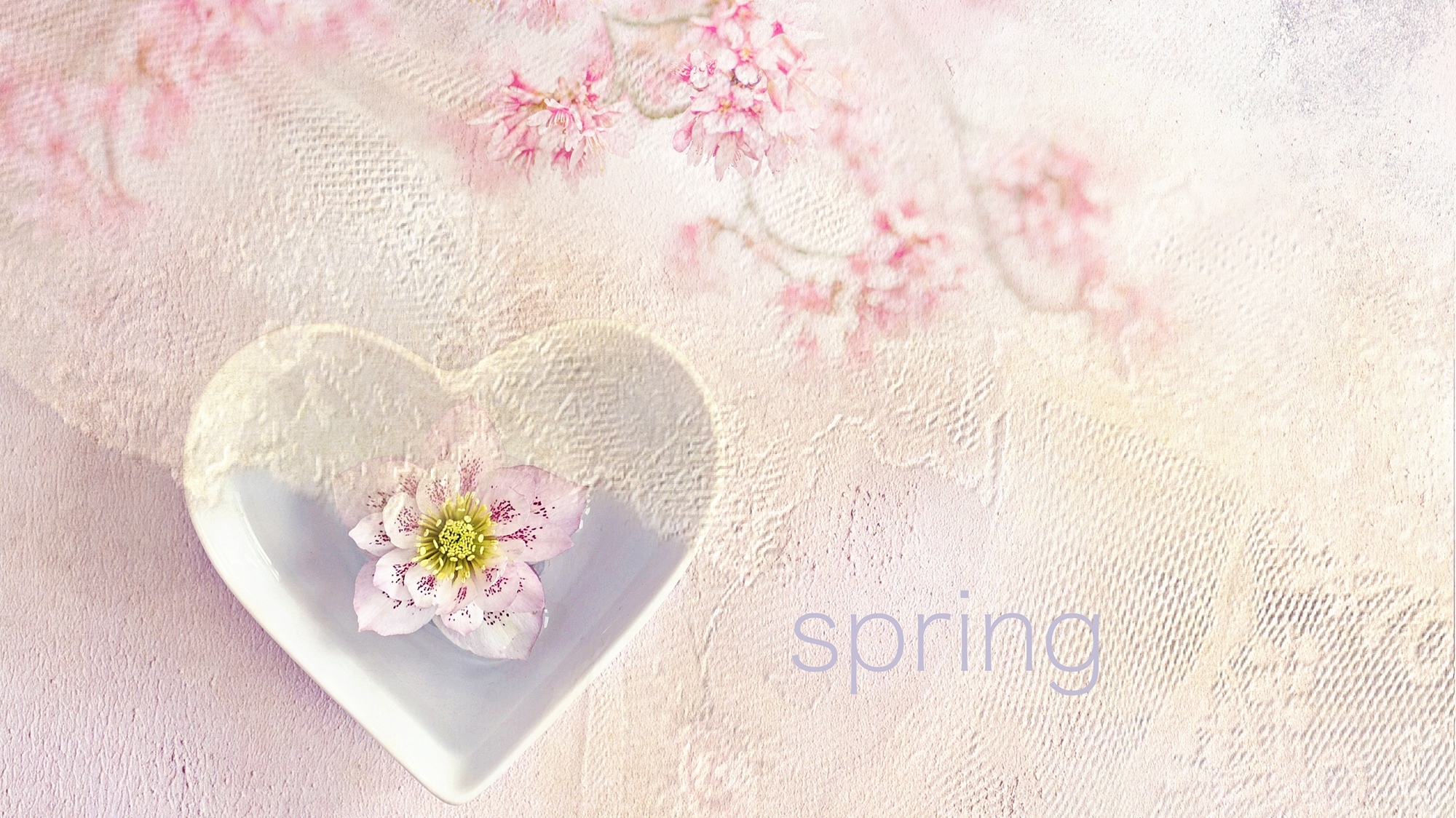 Edytor tapety: Serce z różowym kwiatkiem obok napisu spring