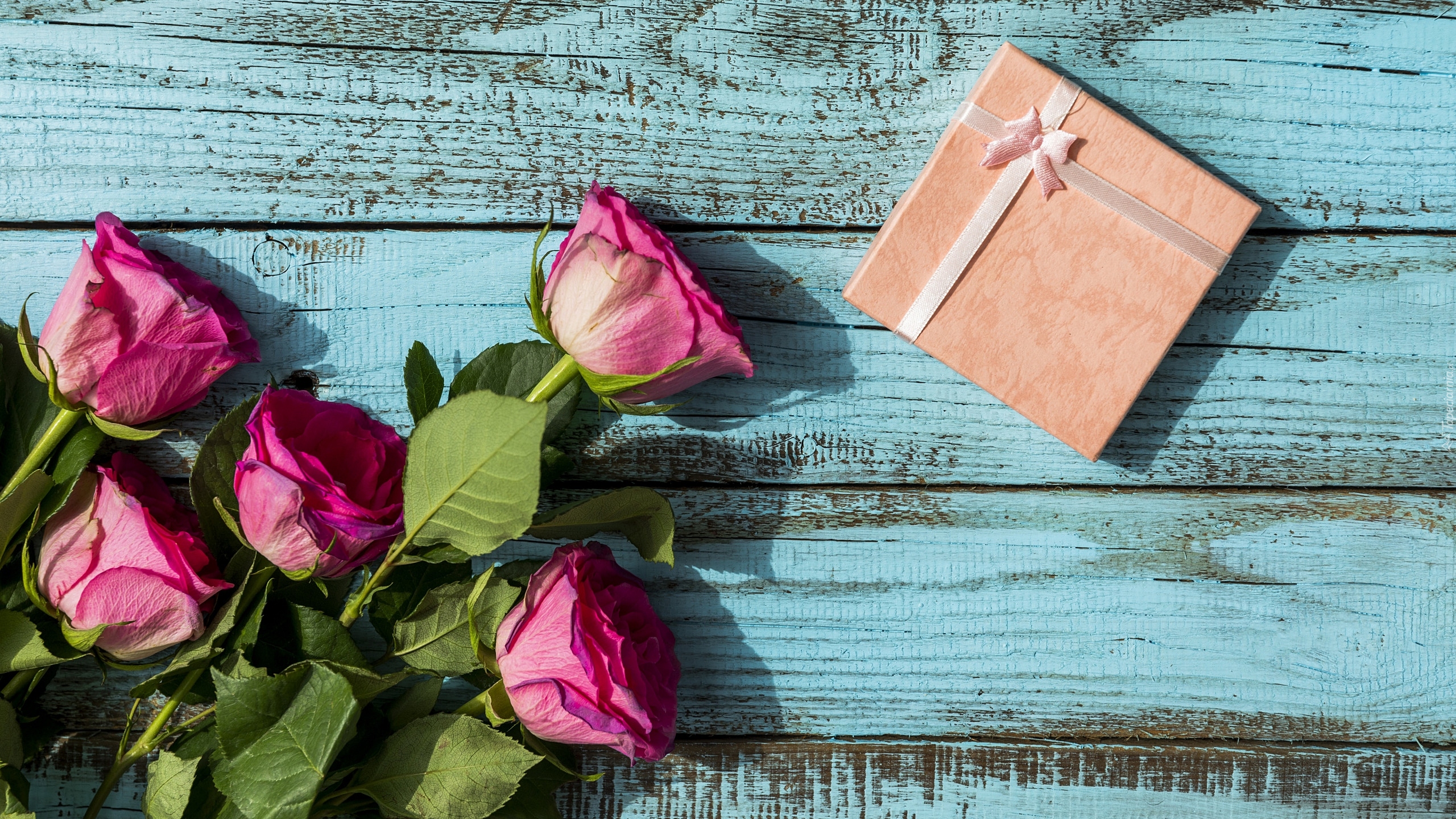 Edytor tapety: Prezent z różowymi różami na niebieskich deskach