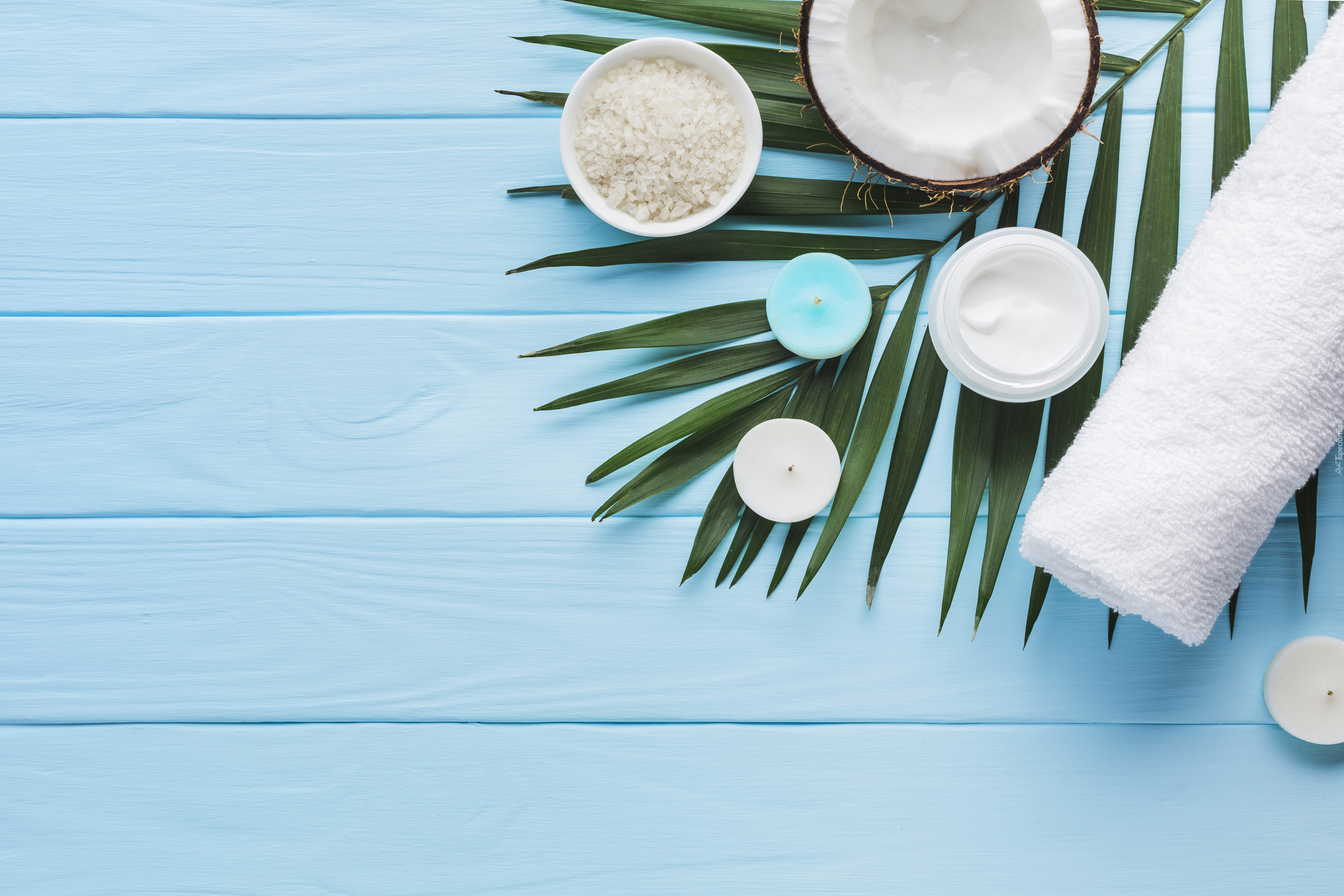 Edytor tapety: Ręcznik ze świecami obok kokosa i soli
