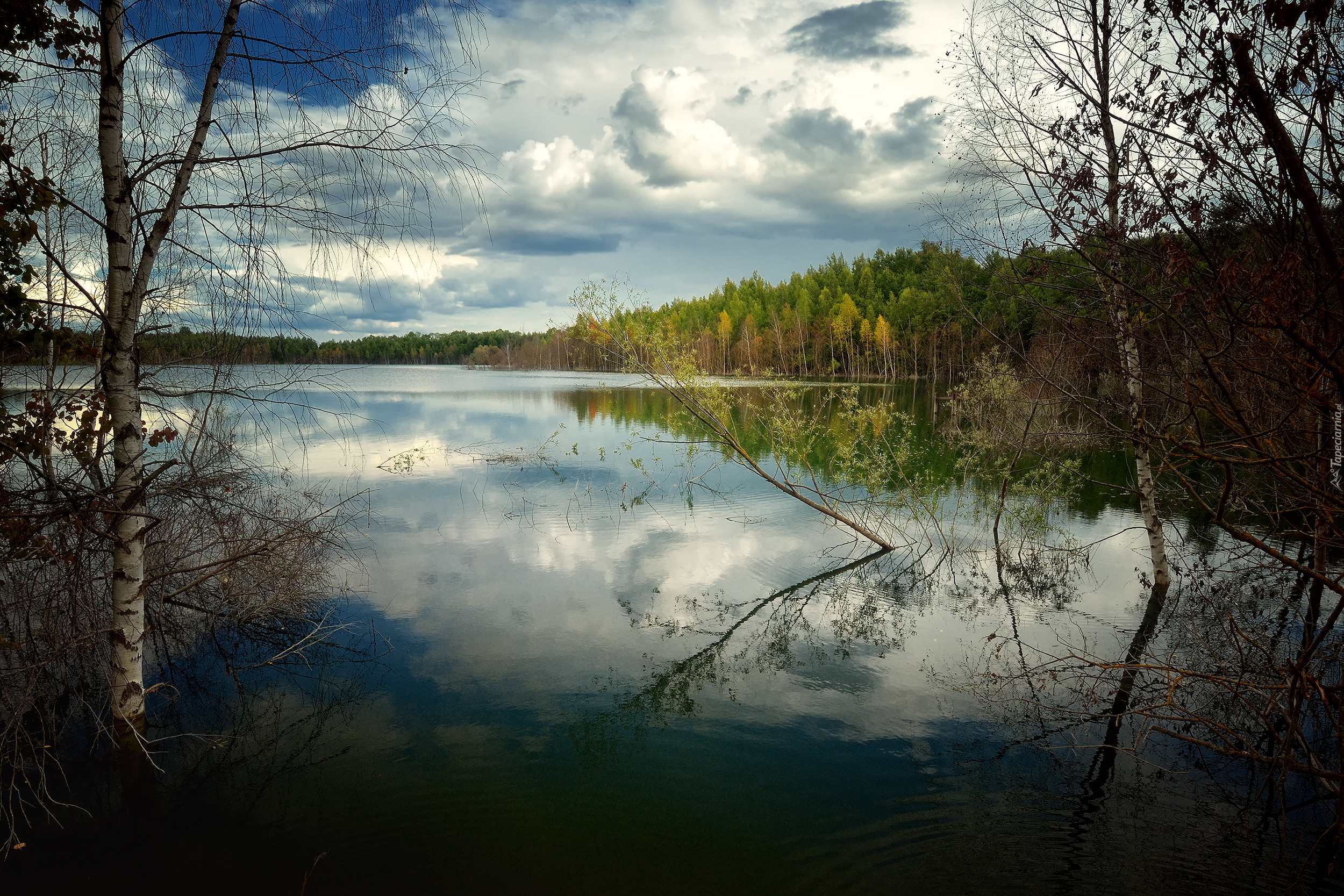 Edytor tapety: Odbicie chmur w leśnym jeziorze
