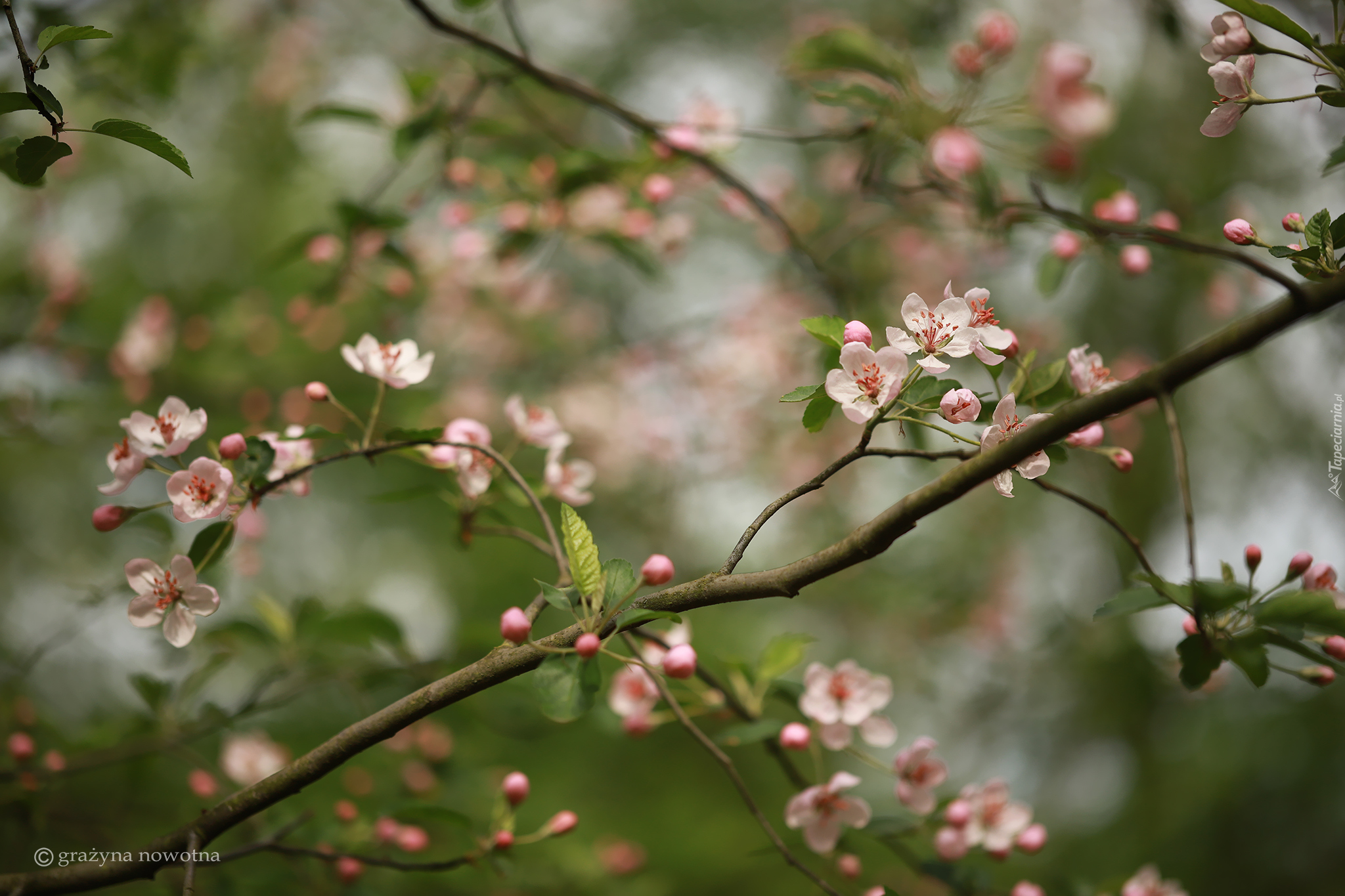 Edytor tapety: Różowe kwiaty na gałązce drzewa owocowego