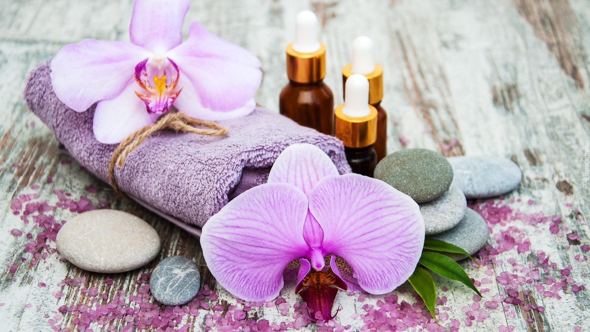 Edytor tapety: Dwa storczyki obok ręcznika i buteleczek