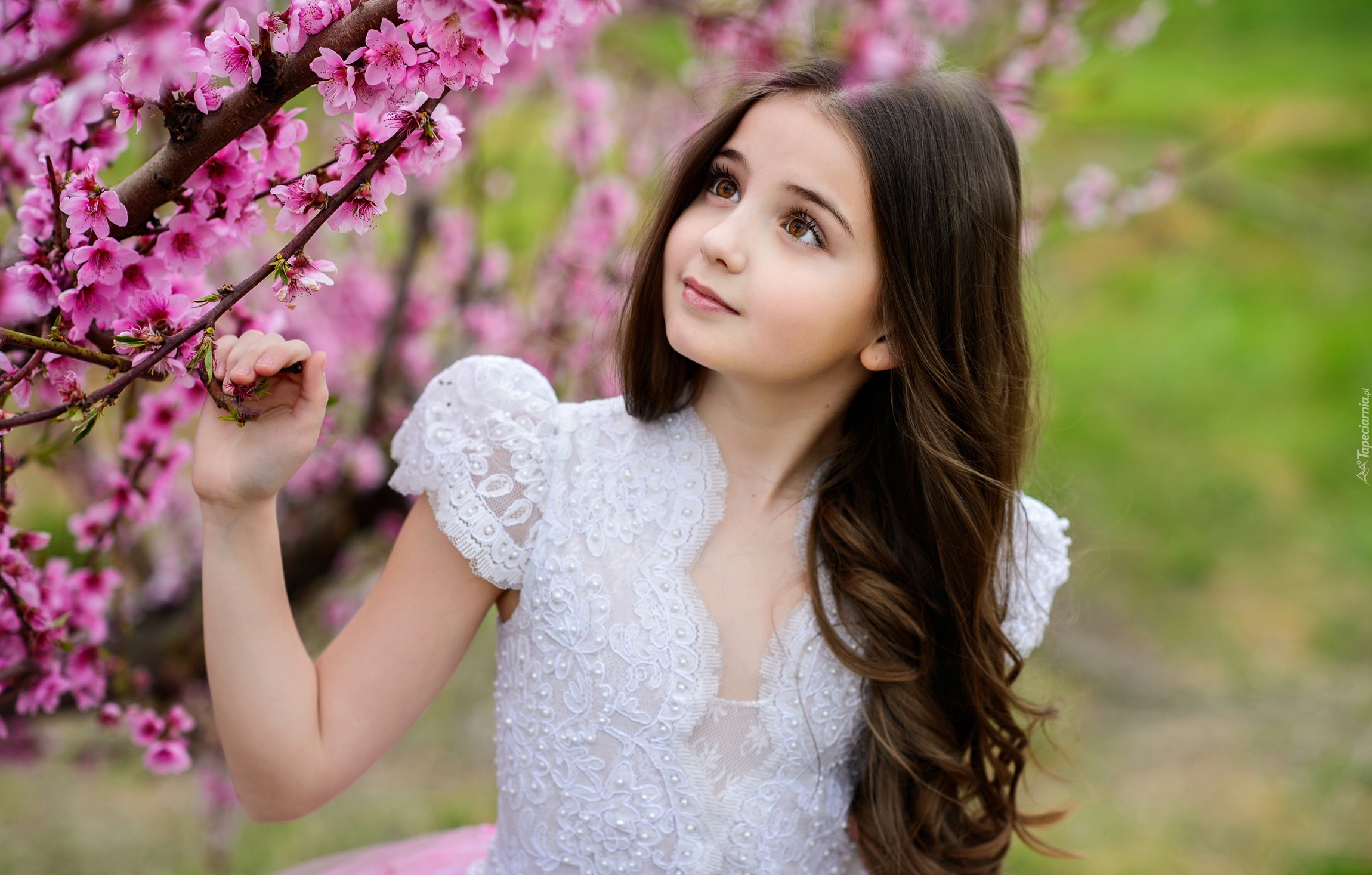 Edytor tapety: Długowłosa dziewczynka obok kwitnących gałązek