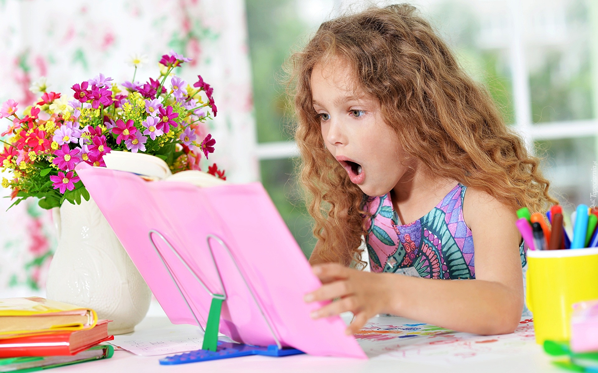 Edytor tapety: Zdziwiona dziewczynka ogląda książkę