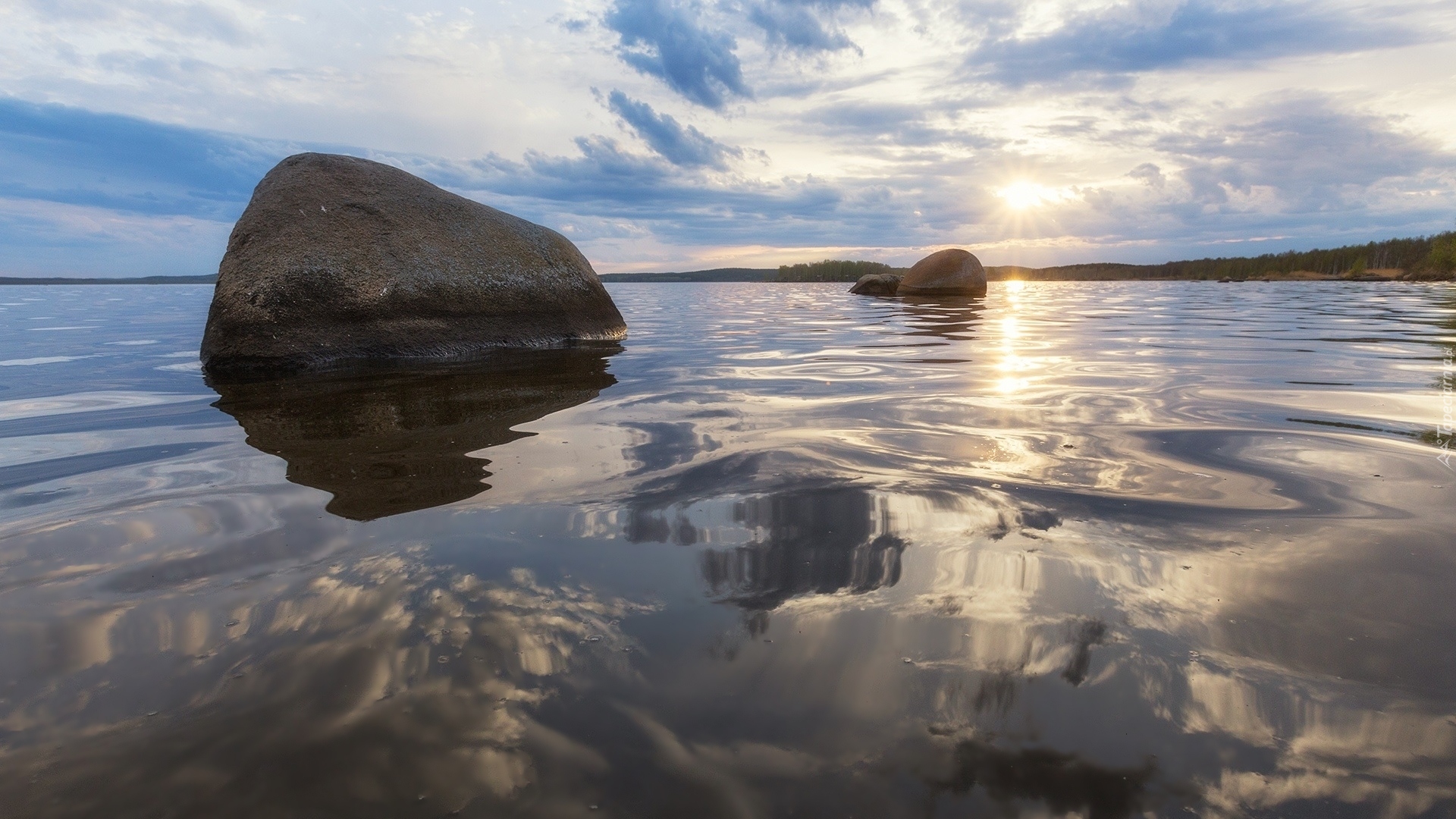 Edytor tapety: Głazy w morzu rozświetlonym wschodem słońca