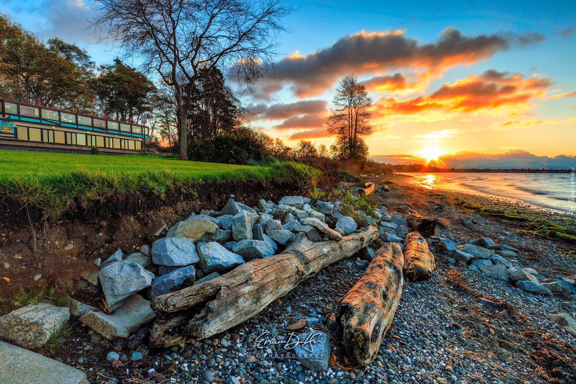 Edytor tapety: Kłody spróchniałego drzewa i kamienie na brzegu morza