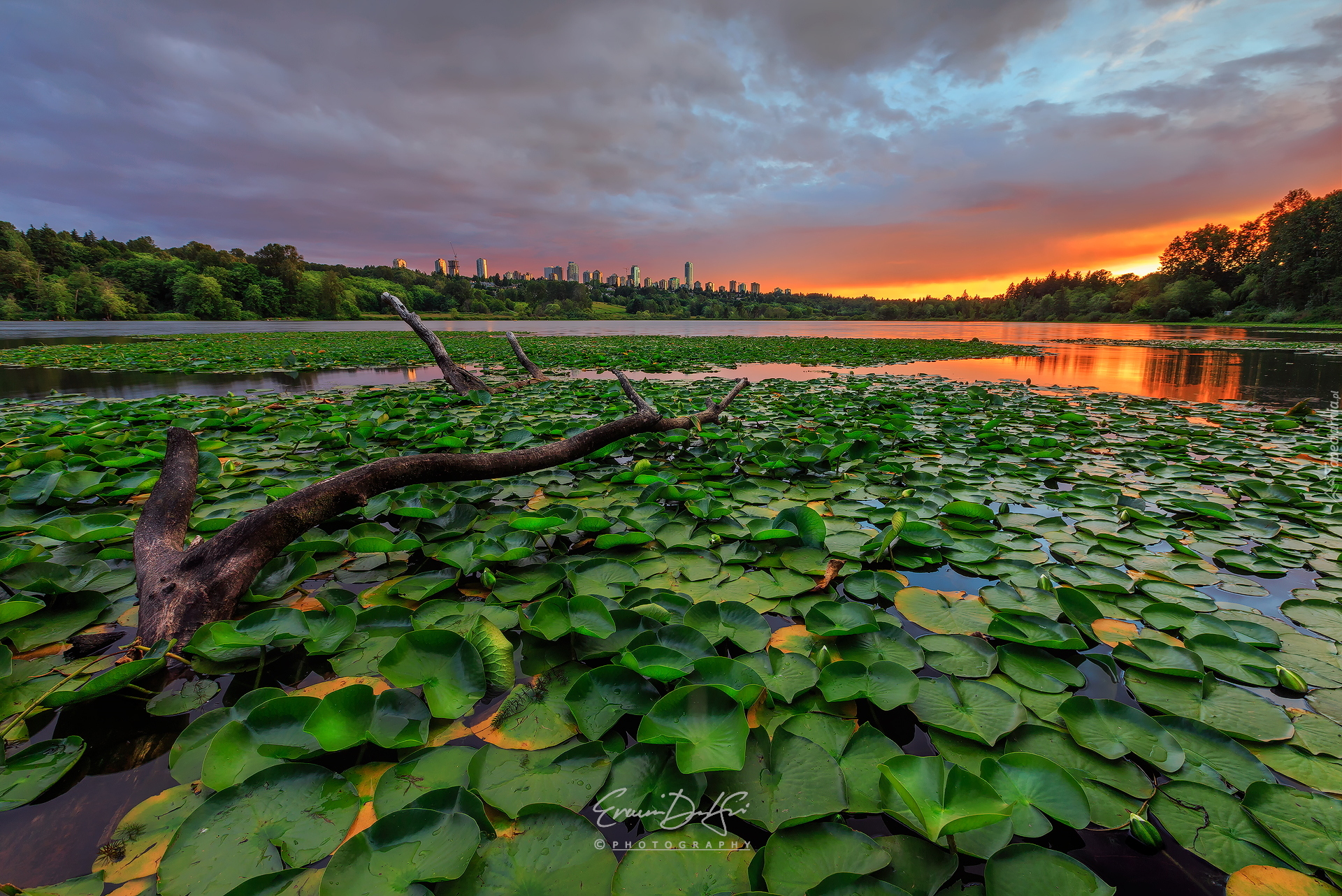 Edytor tapety: Liście wodnych lilii na stawie w zachodzącym słońcu