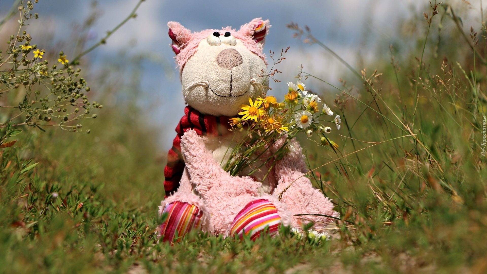 Edytor tapety: Pluszowy kot z kwiatami