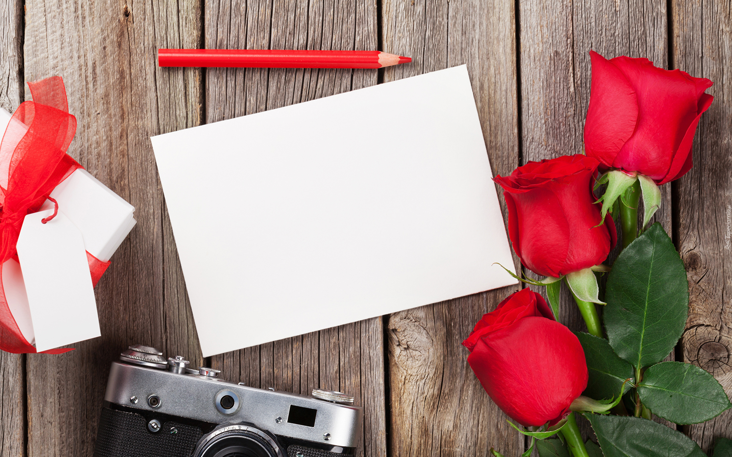 Edytor tapety: Prezent z różami obok kartki i aparatu