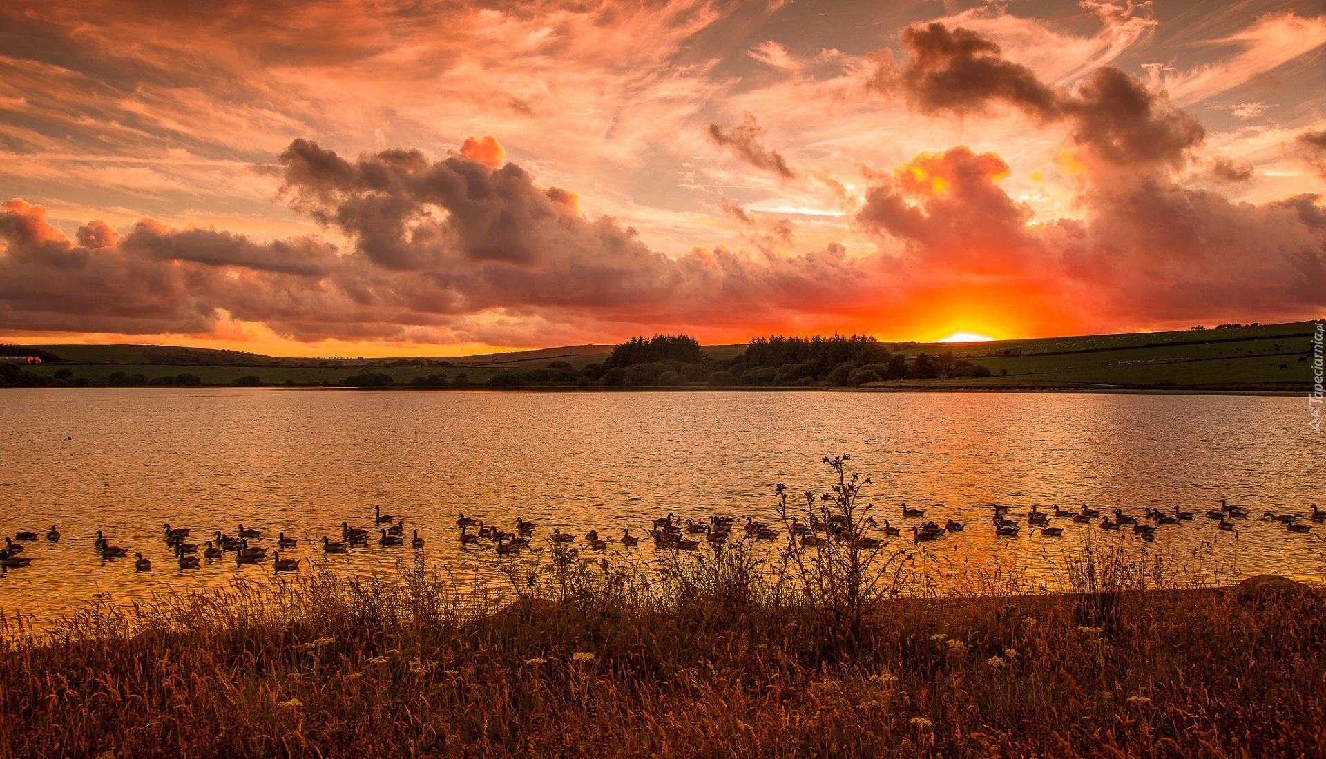 Edytor tapety: Kaczki na jeziorze w blasku zachodzącego słońca