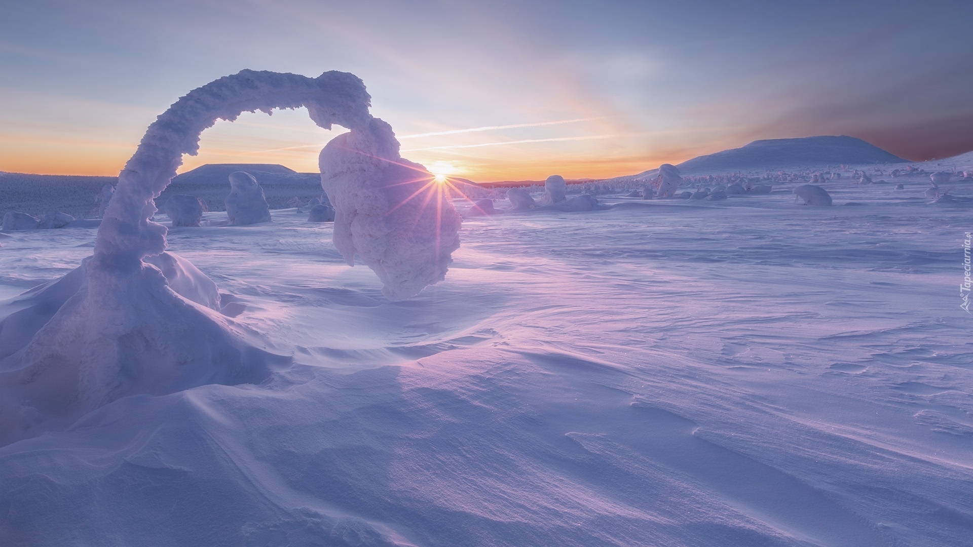 Edytor tapety: Promienie zachodzącego słońca na ośnieżonym drzewku