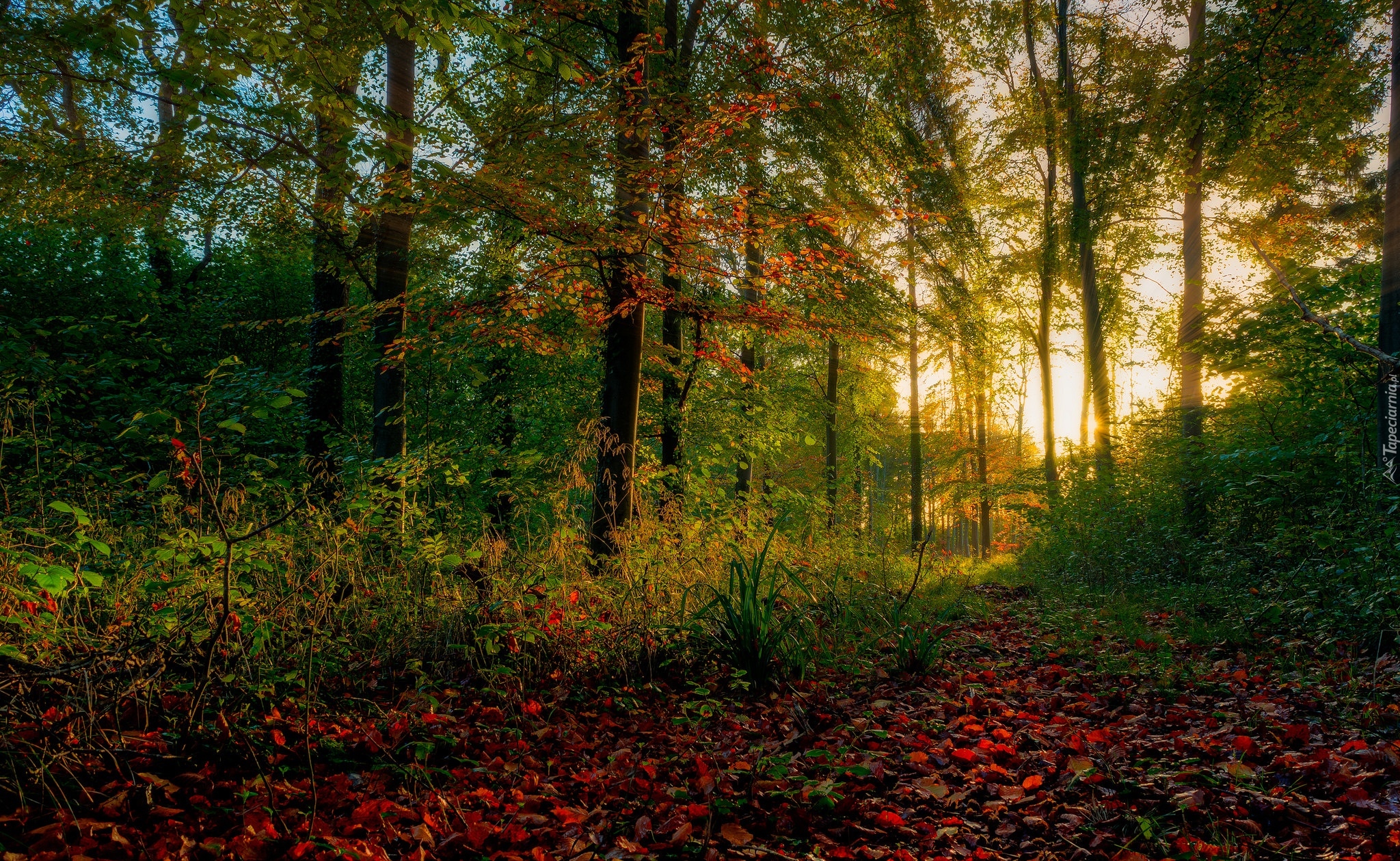 Edytor tapety: Promienie słońca na leśnych drzewach