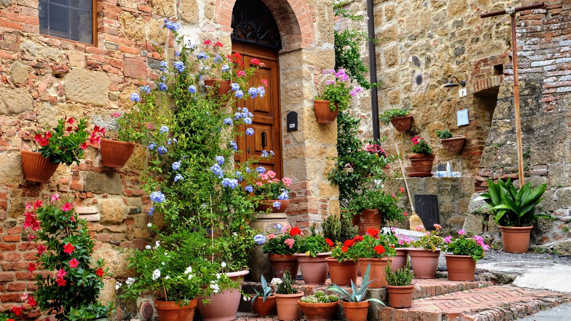 Edytor tapety: Kwiaty w donicach przed wejściem do domu