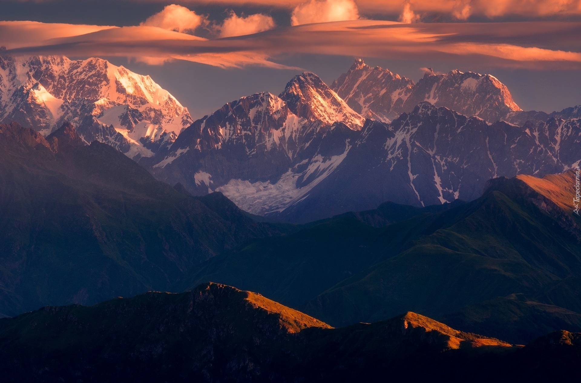 Edytor tapety: Rozświetlone słońcem szczyty gór