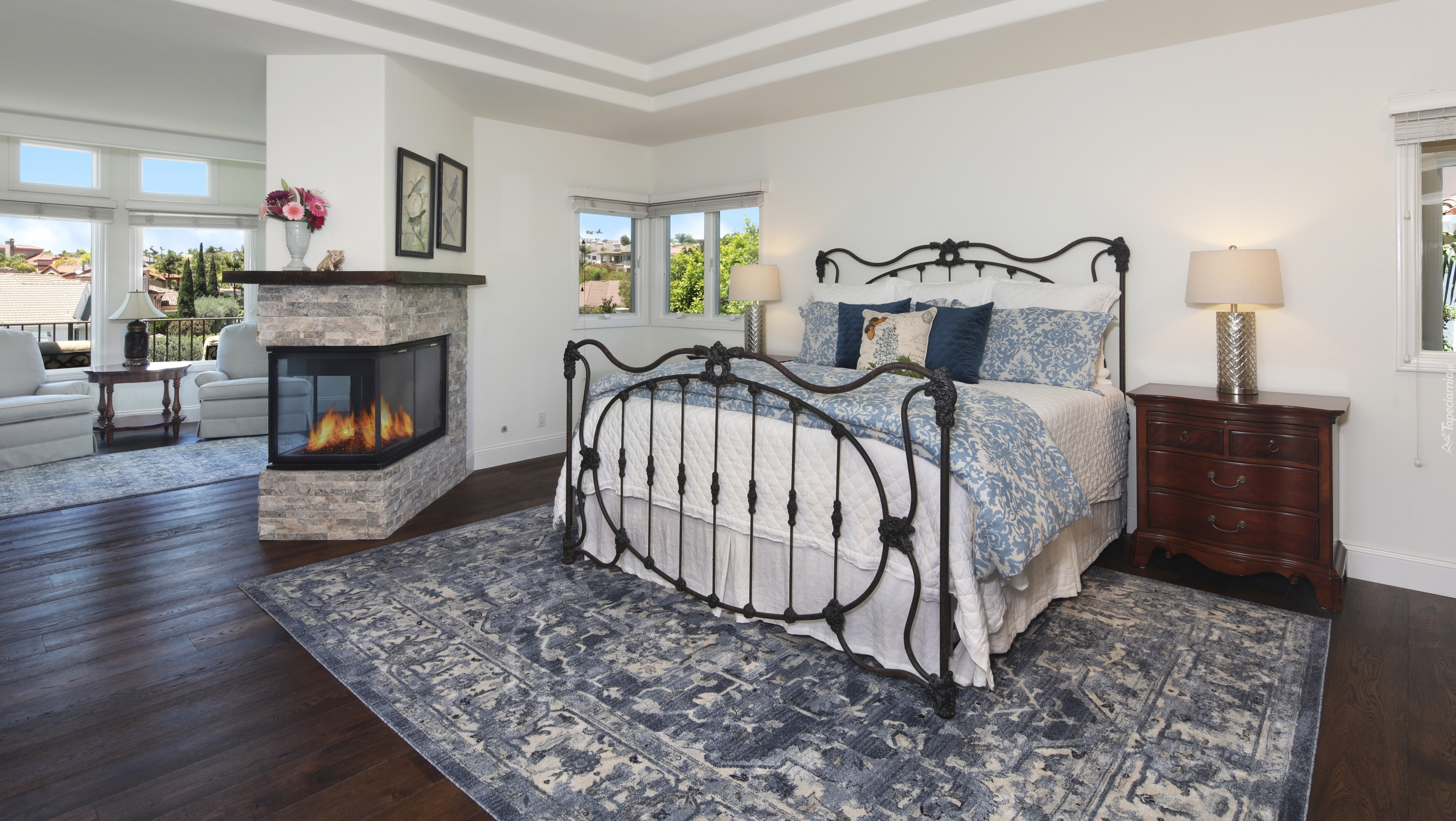 Edytor tapety: Metalowe łóżko i kominek w sypialni
