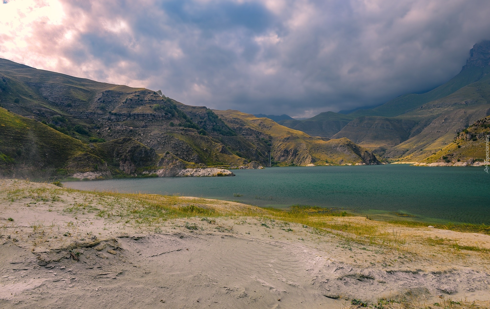 Edytor tapety: Jezioro i góry pod chmurami