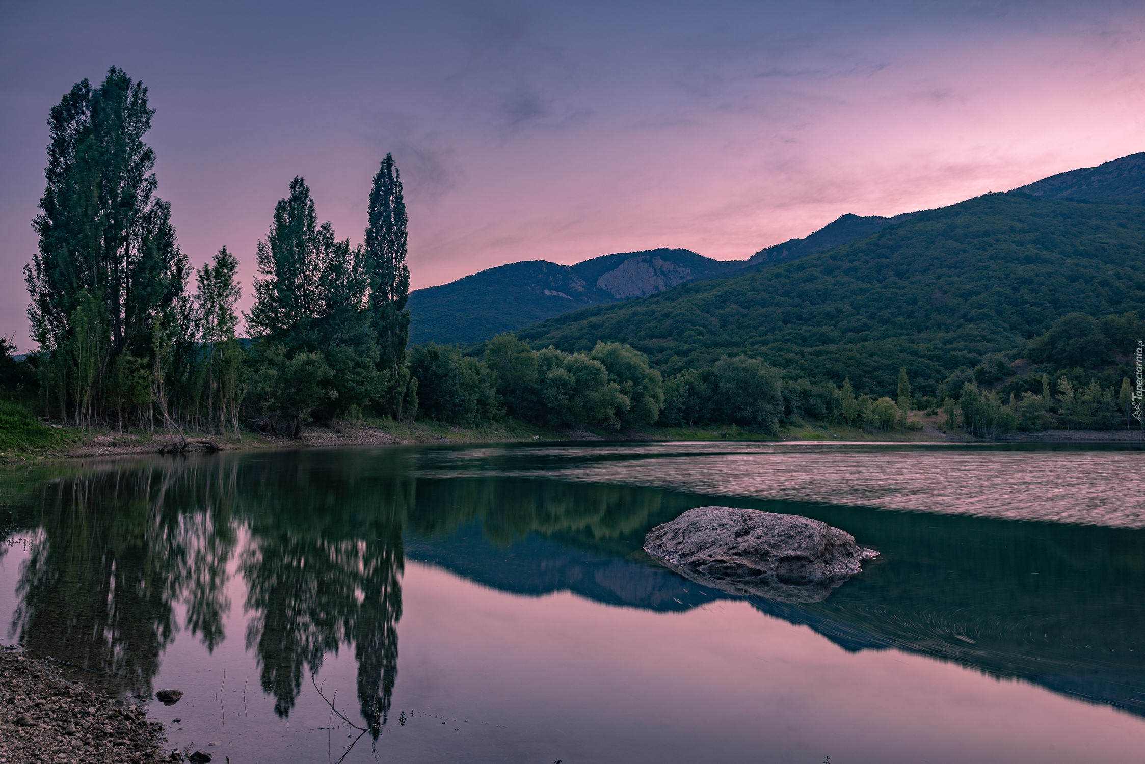 Edytor tapety: Odbicie drzew i gór w wodzie