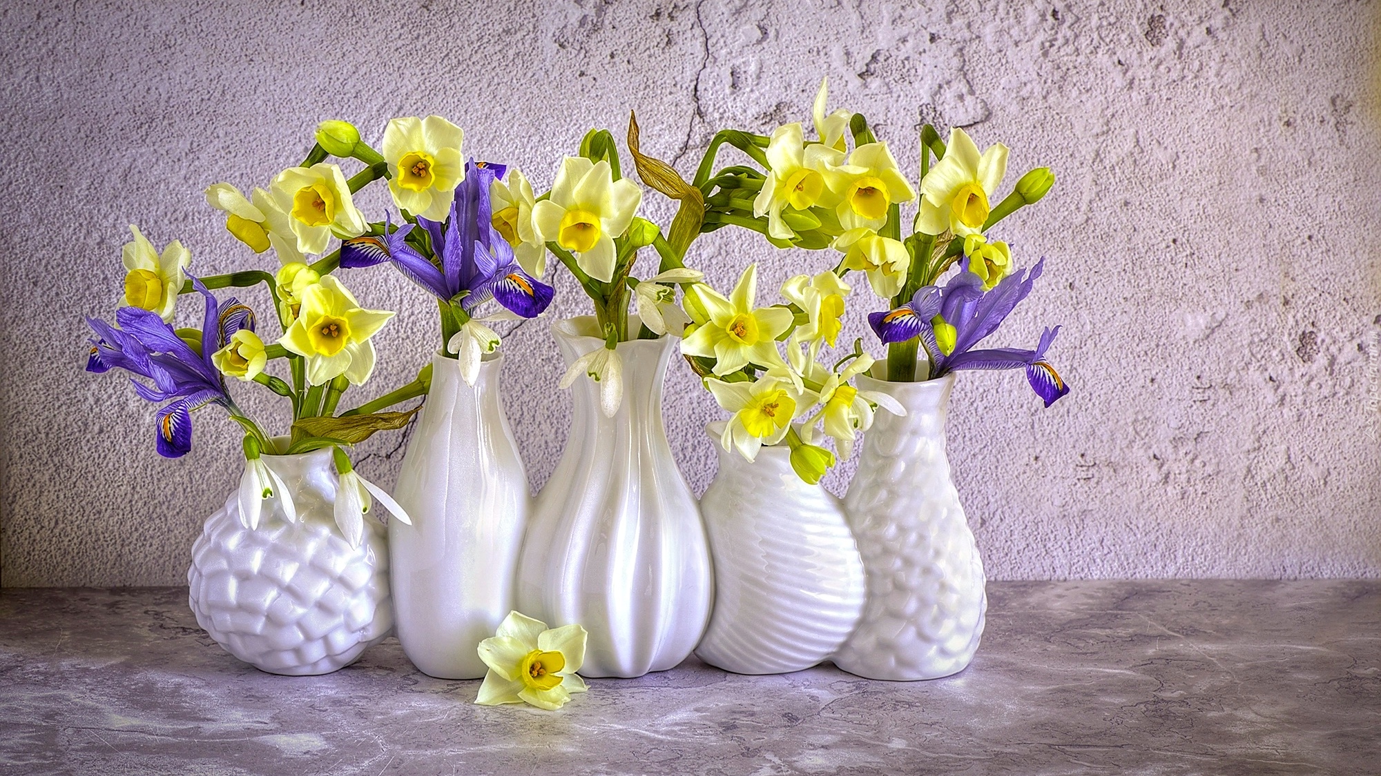Edytor tapety: Irysy i narcyzy żonkile w białych wazonach