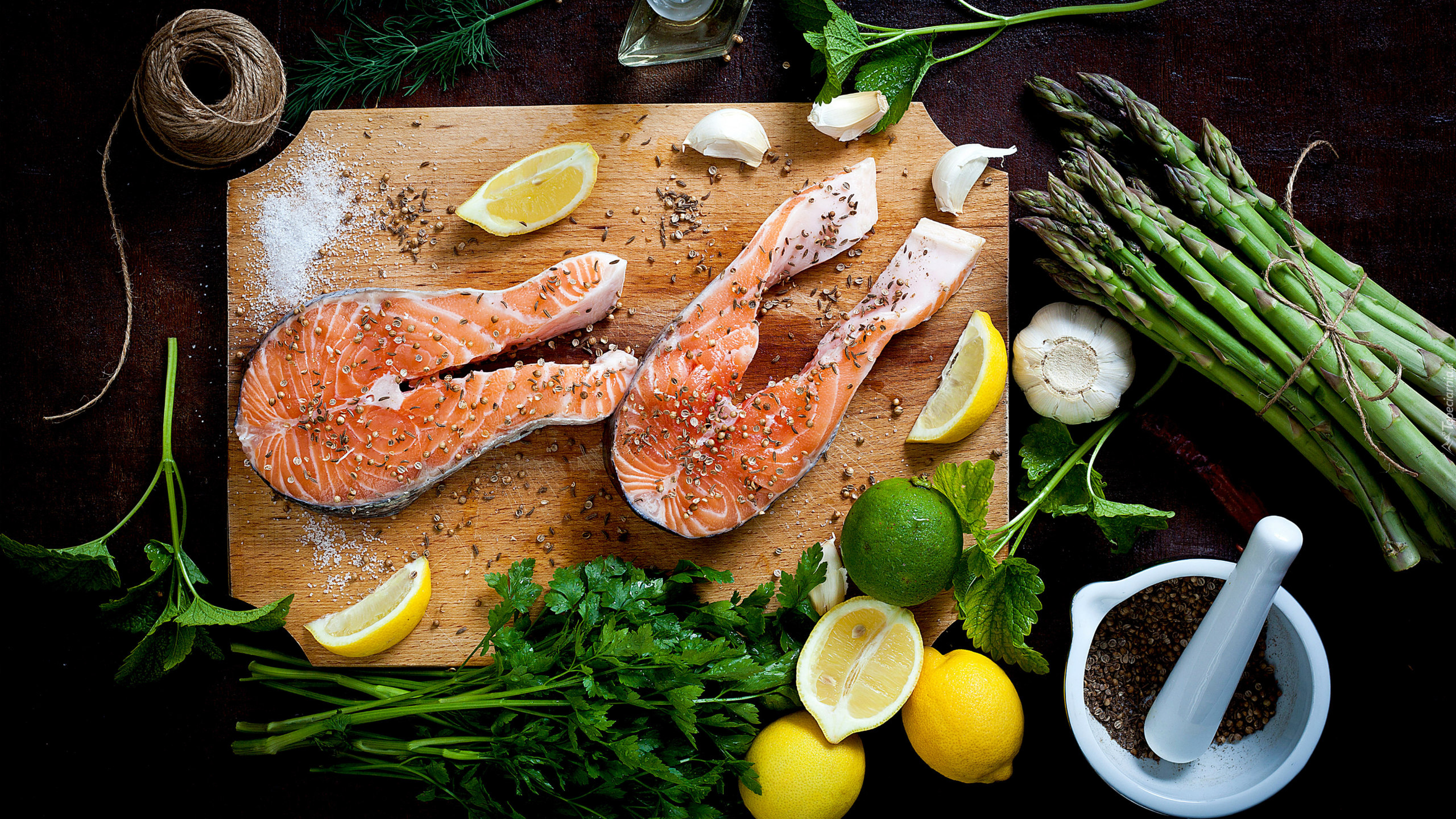 Edytor tapety: Dzwonki łososia obok cytryny i czosnku na desce