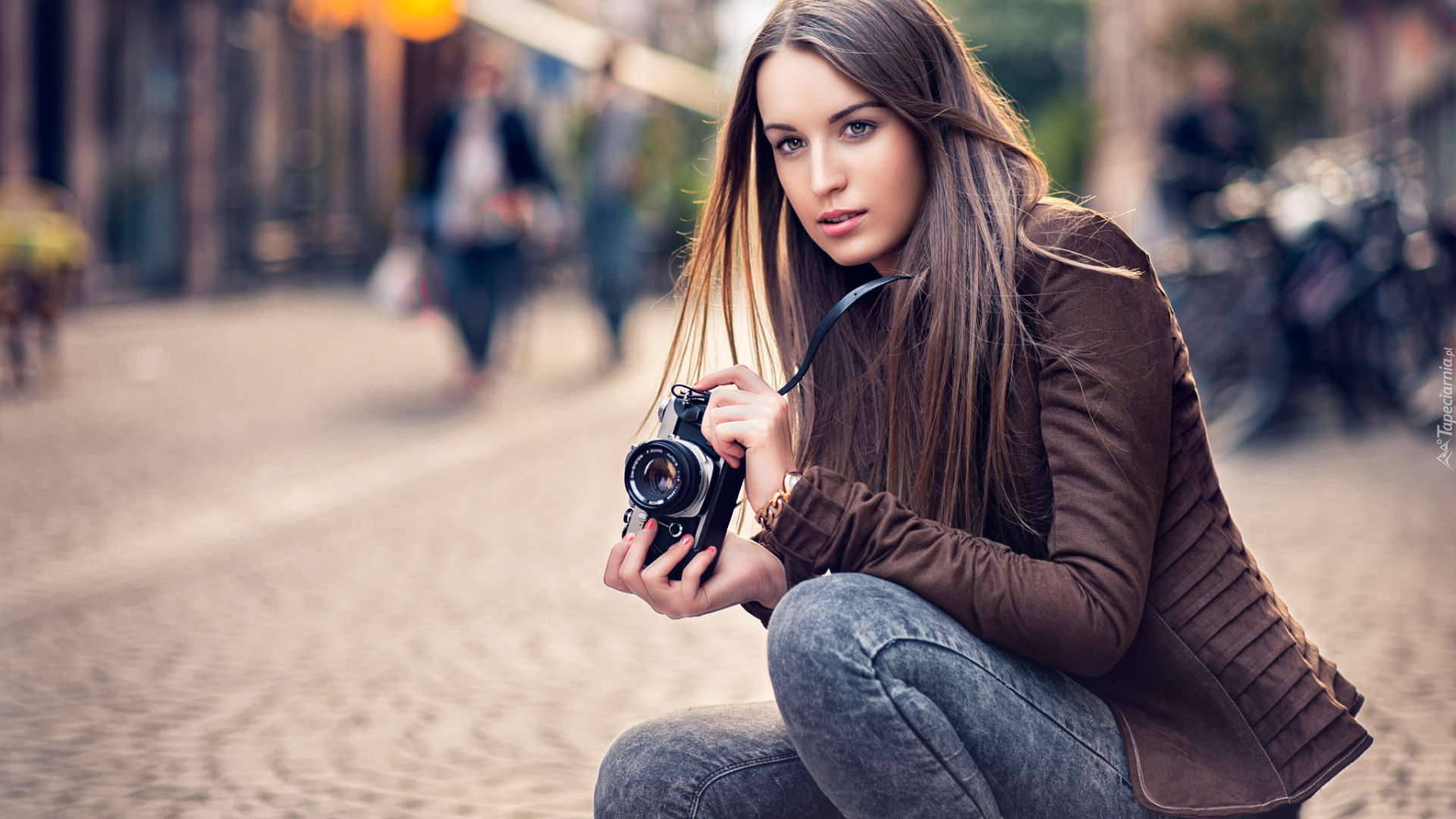 Edytor tapety: Dziewczyna z aparatem fotograficznym w dłoniach