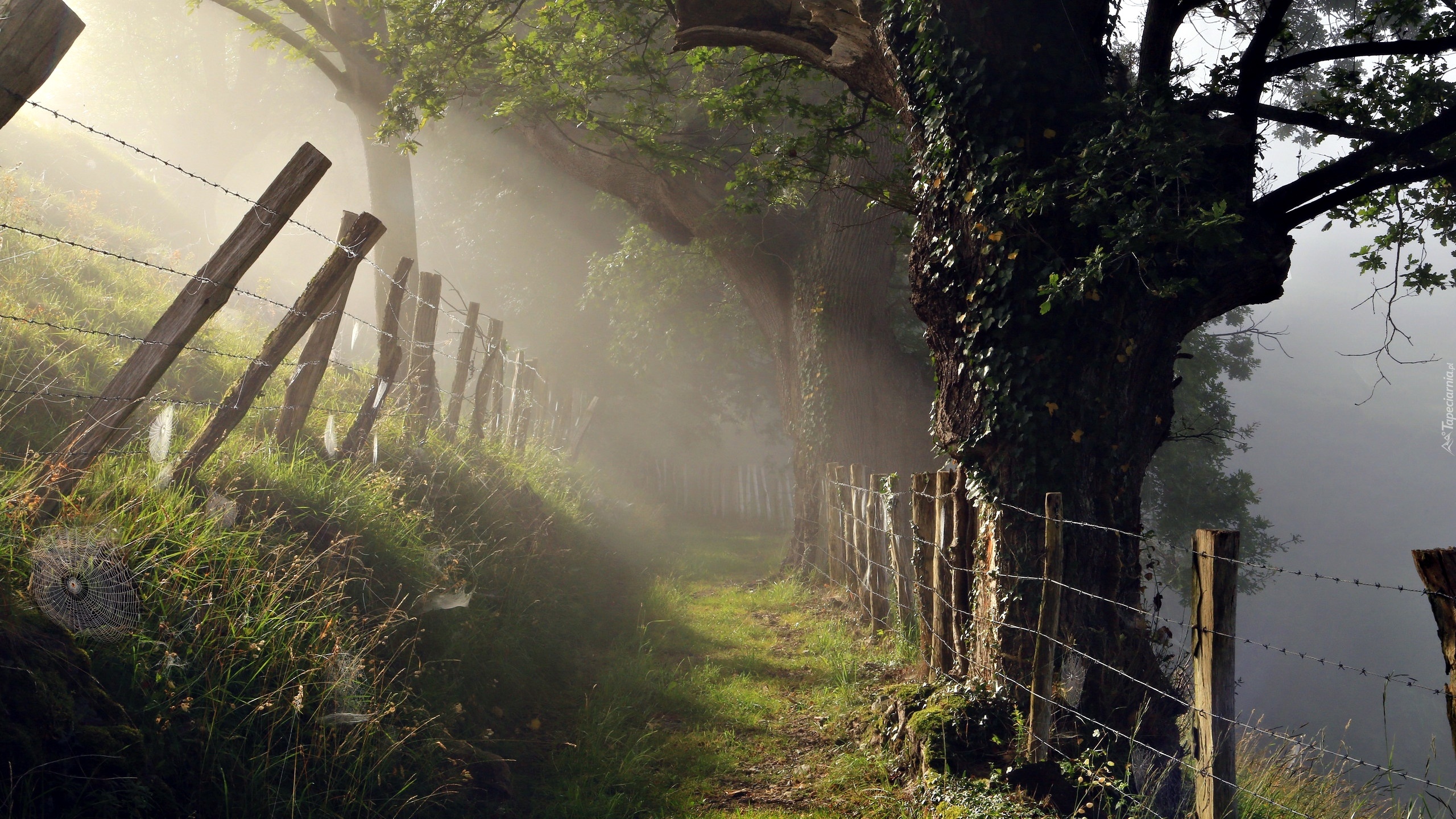Edytor tapety: Płot przy zamglonej drodze