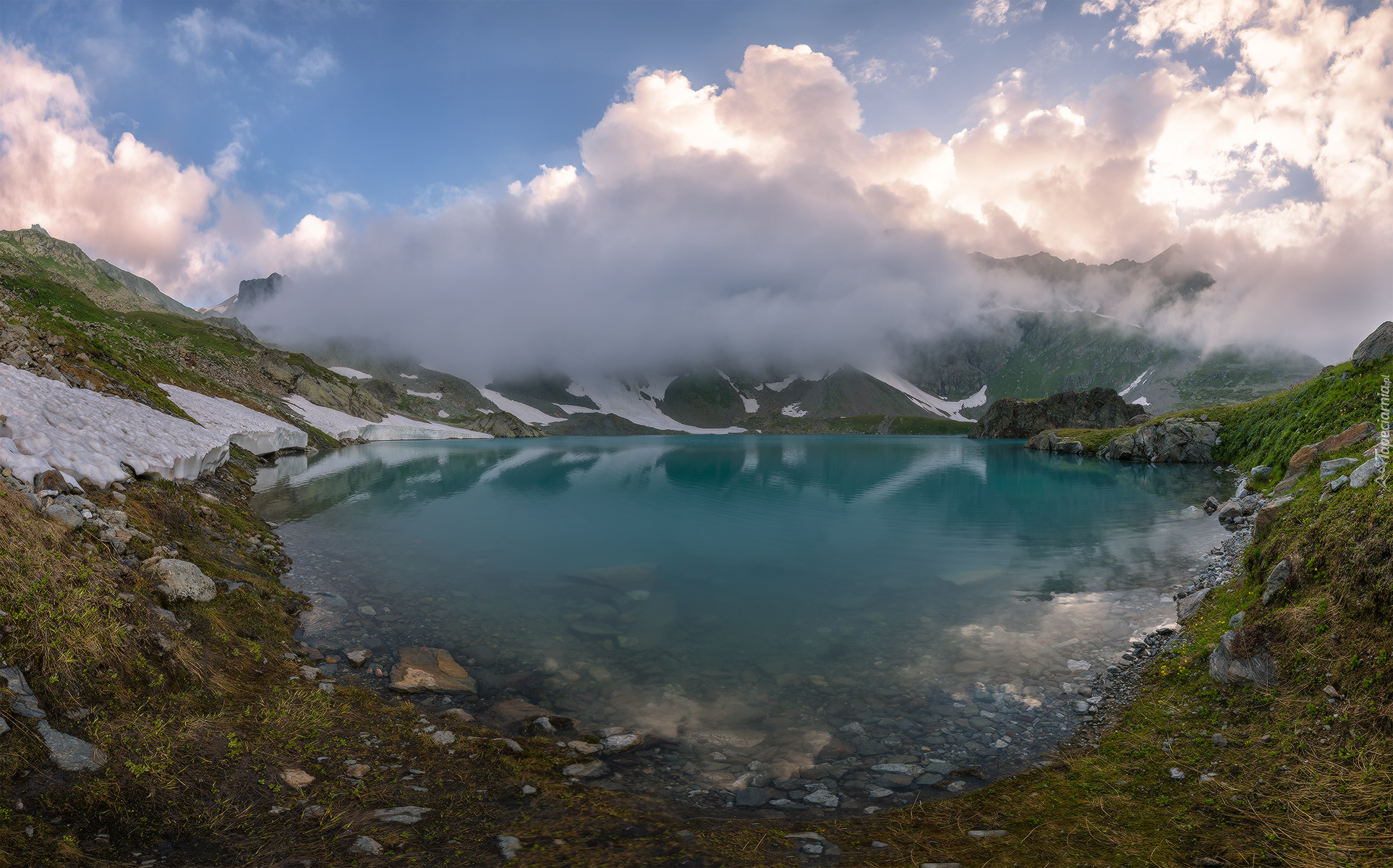 Edytor tapety: Chmury nad jeziorem w górach