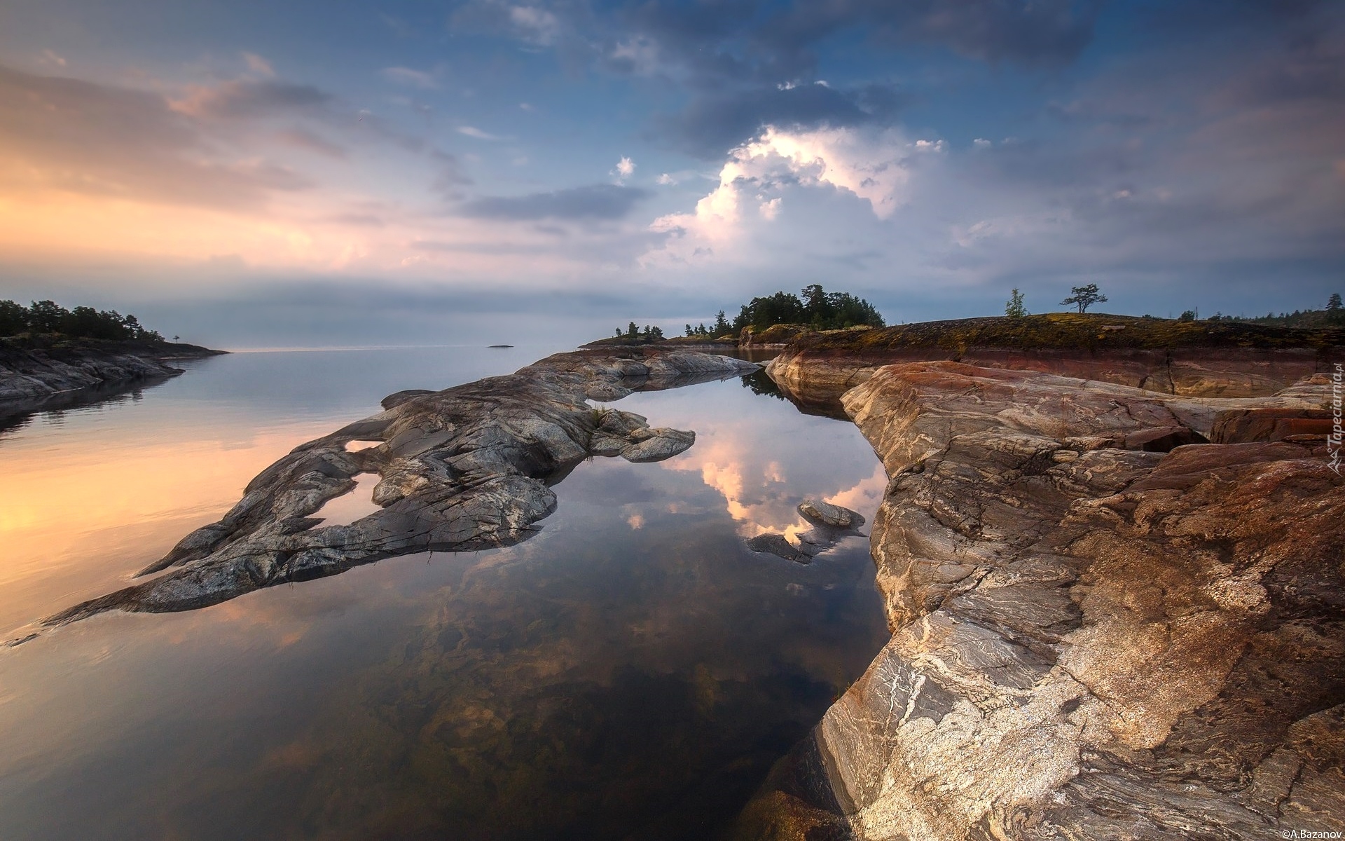Edytor tapety: Skały porośnięte drzewami na jeziorze Ładoga w Rosji