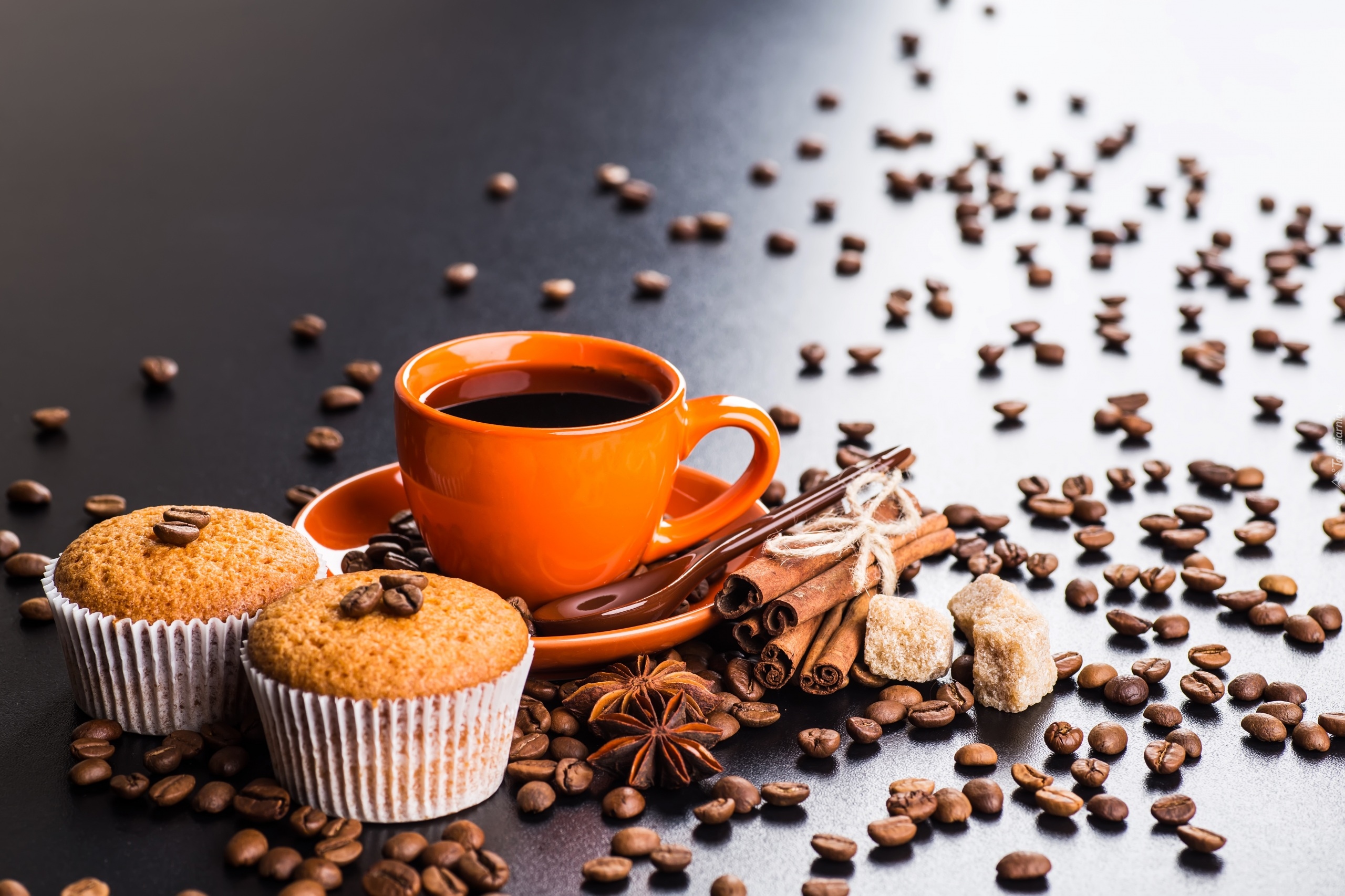 Edytor tapety: Dwie muffinki obok filiżanki kawy