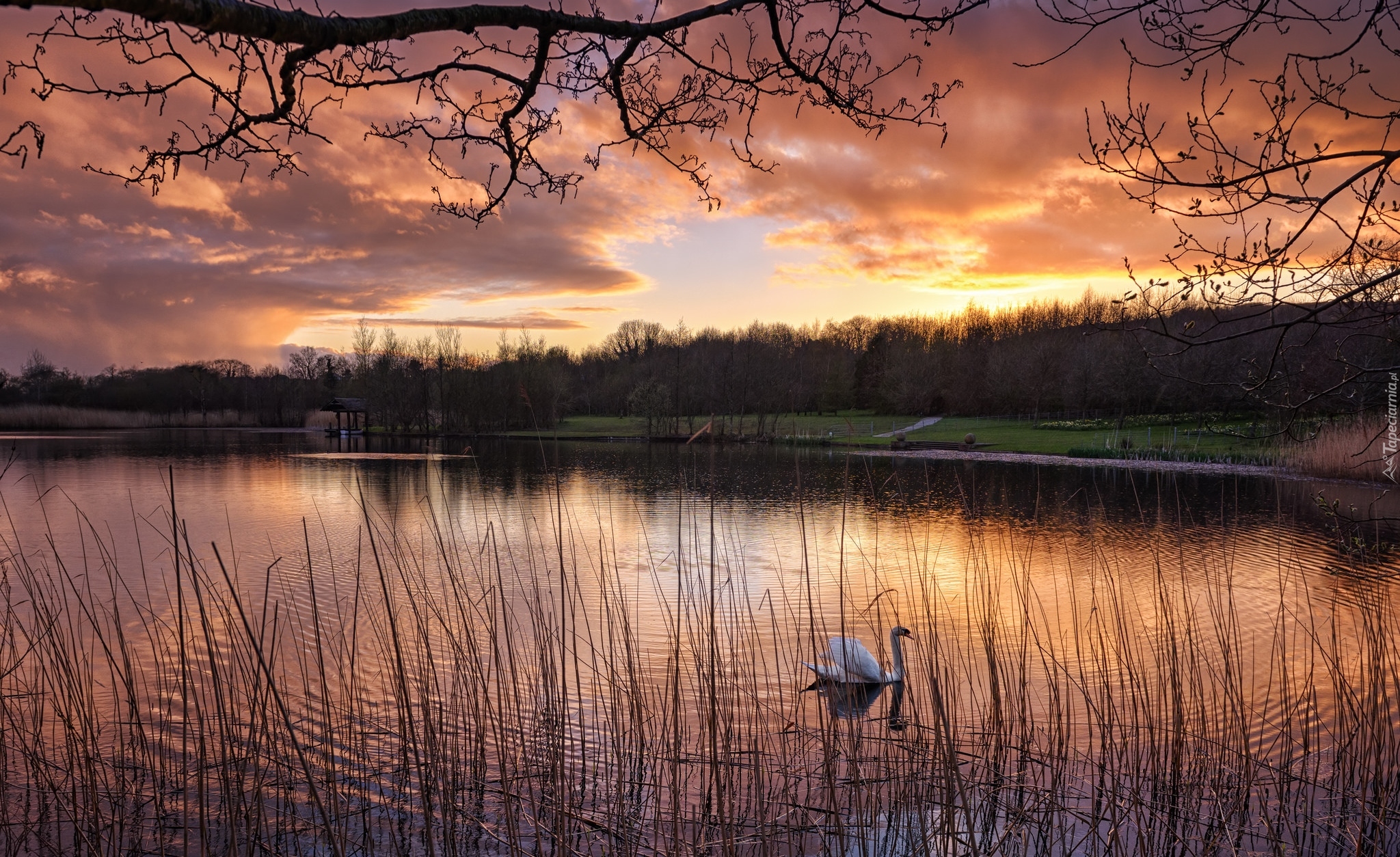 Edytor tapety: Łabędź pływający w stawie