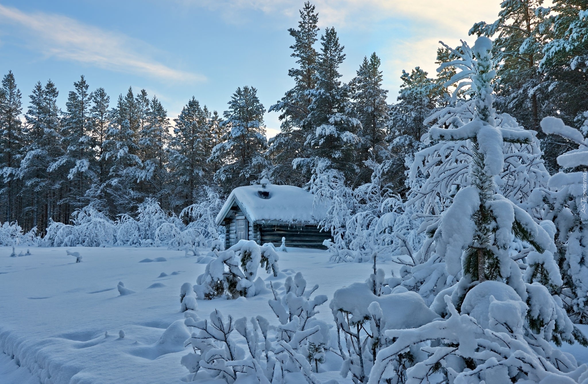 Edytor tapety: Domek w zimowym lesie