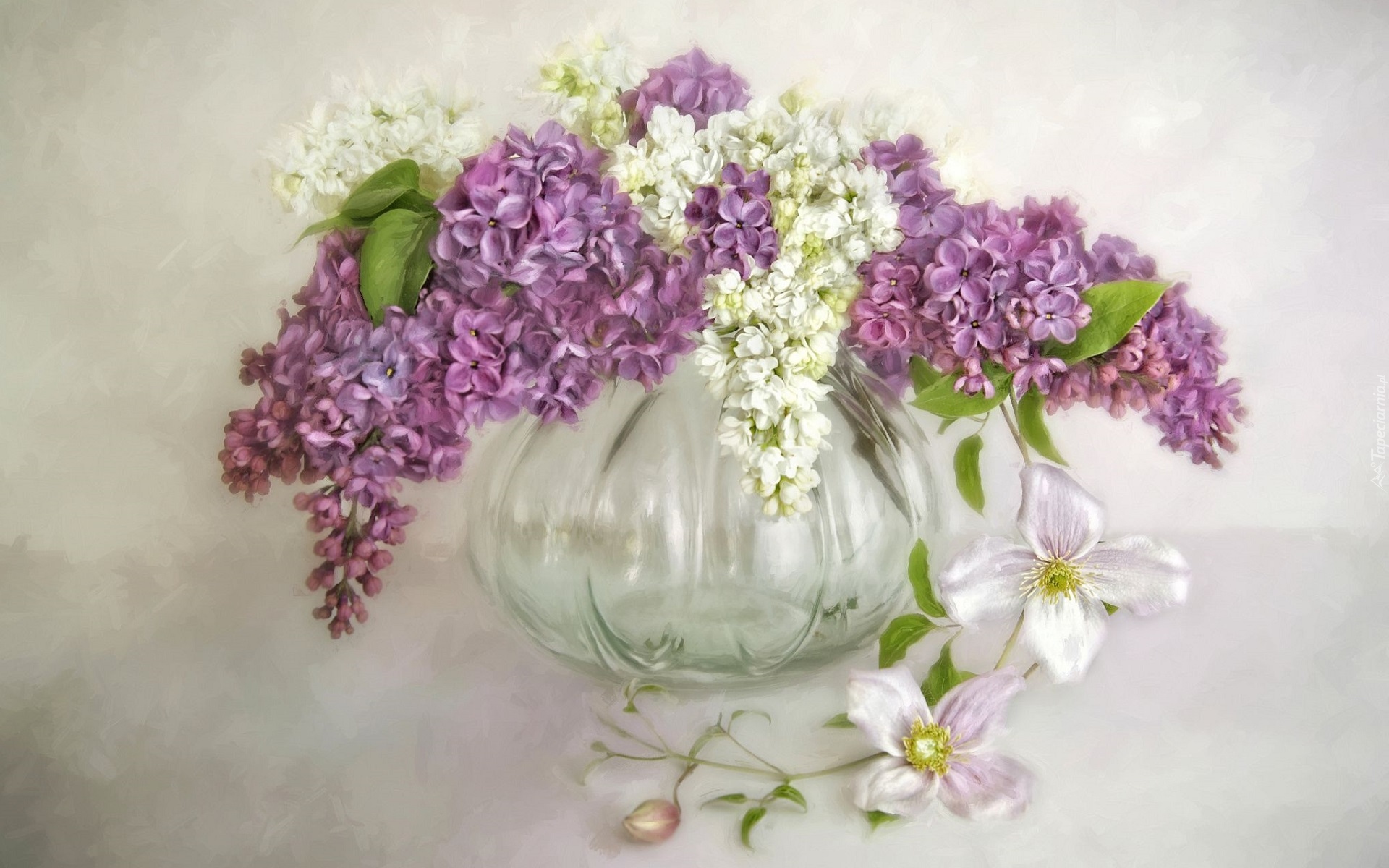 Edytor tapety: Powojnik obok wazonika z gałązkami bzu